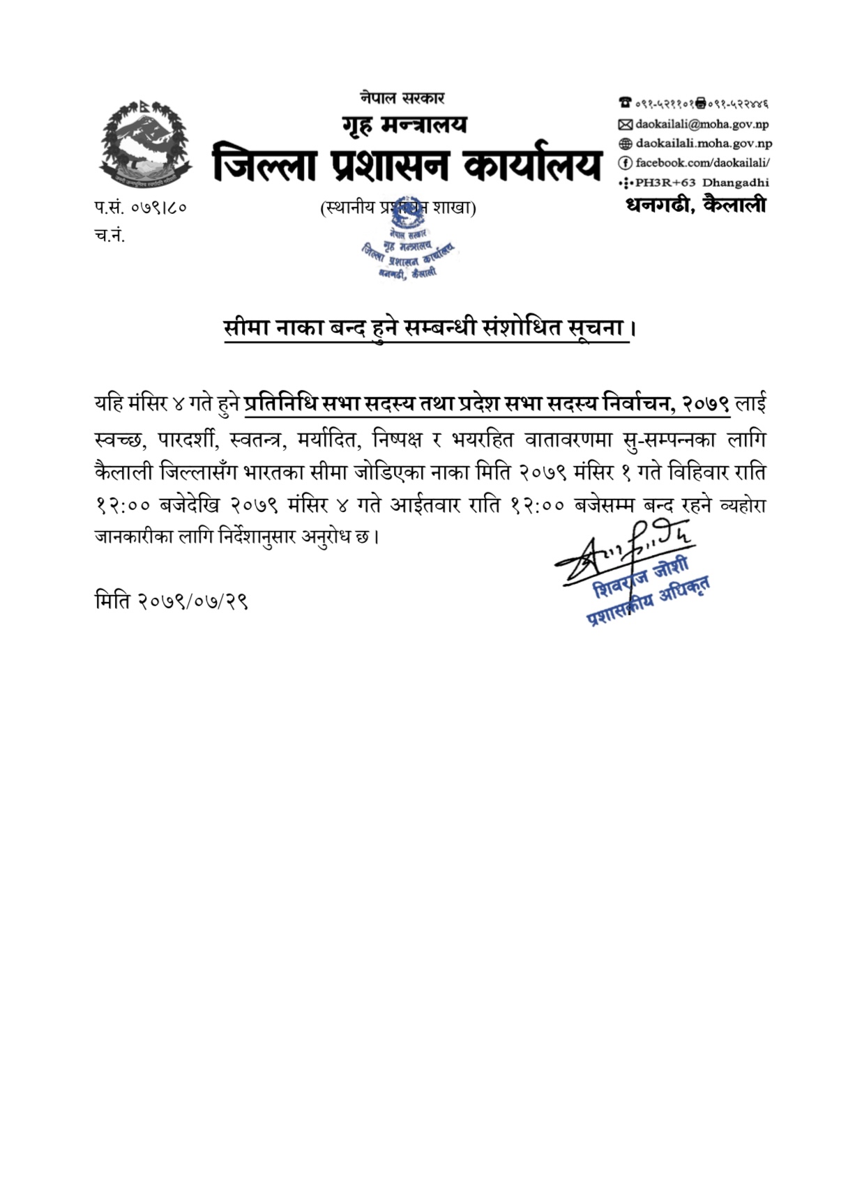 सीमा नाका वन्द रहने सम्वन्धि अत्यन्त जरुरी सूचना