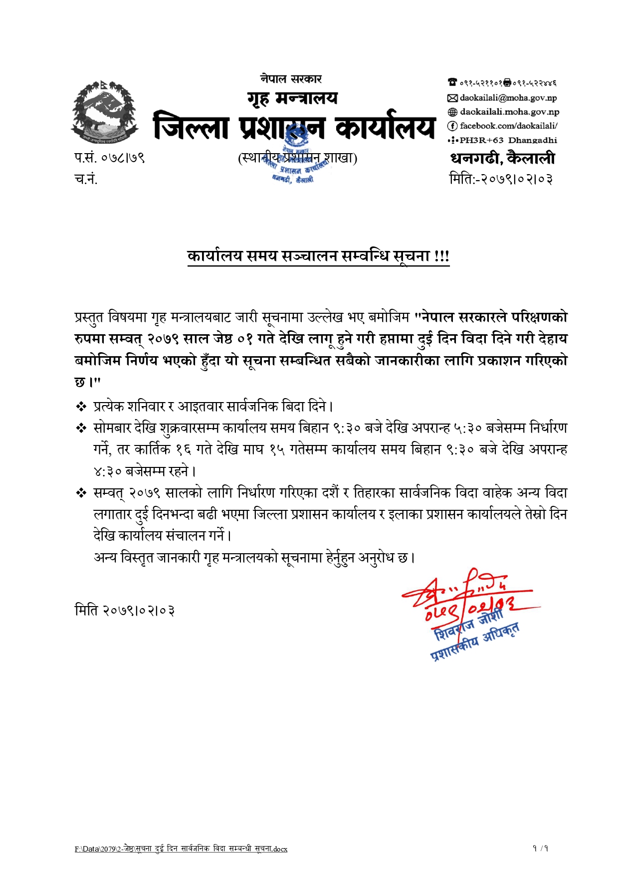 कार्यालय समय सञ्चालन सम्वन्धि सूचना !!!