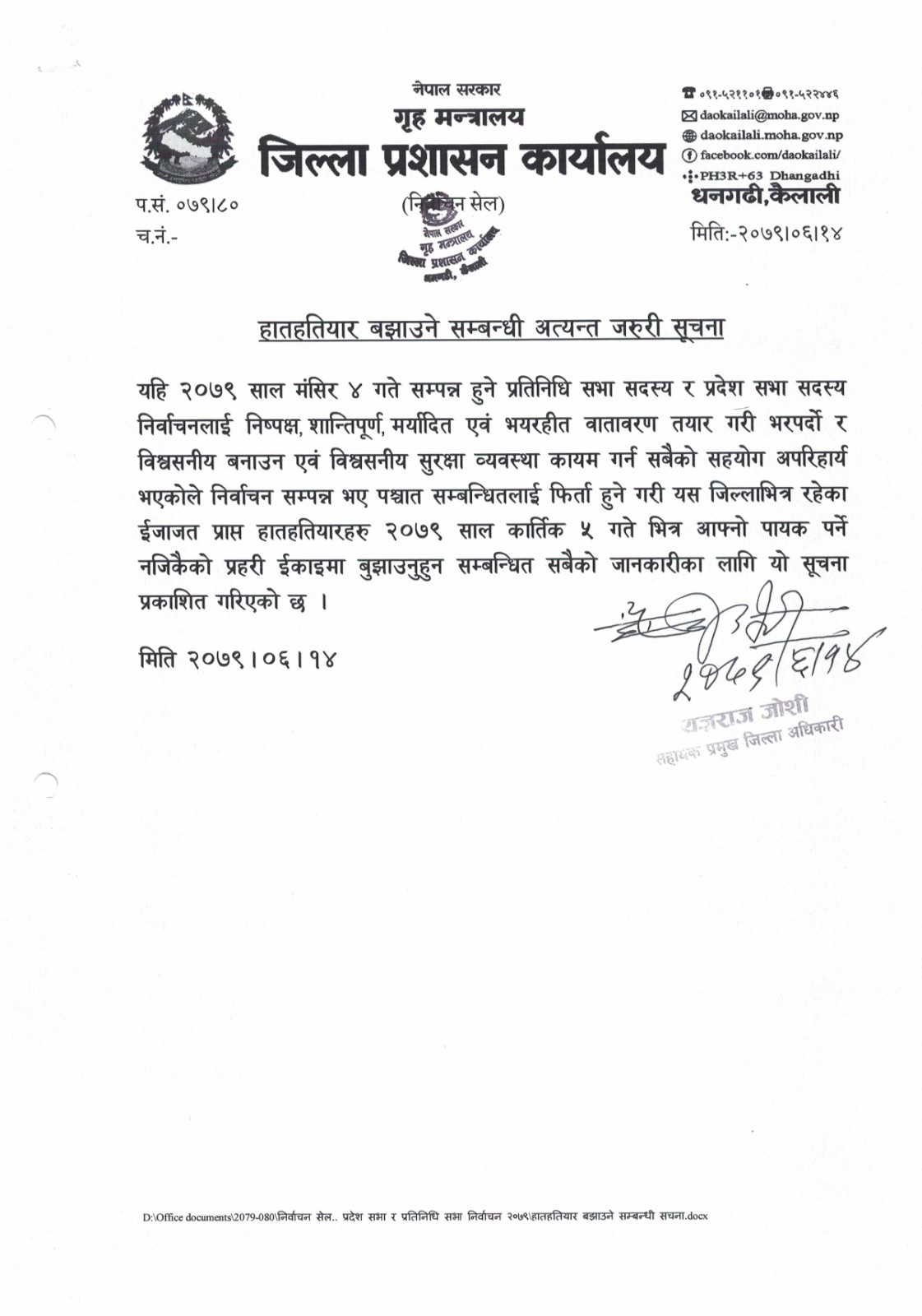 हातहतियार वुझाउने सम्वन्धि अत्यन्त जरुरी सूचना
