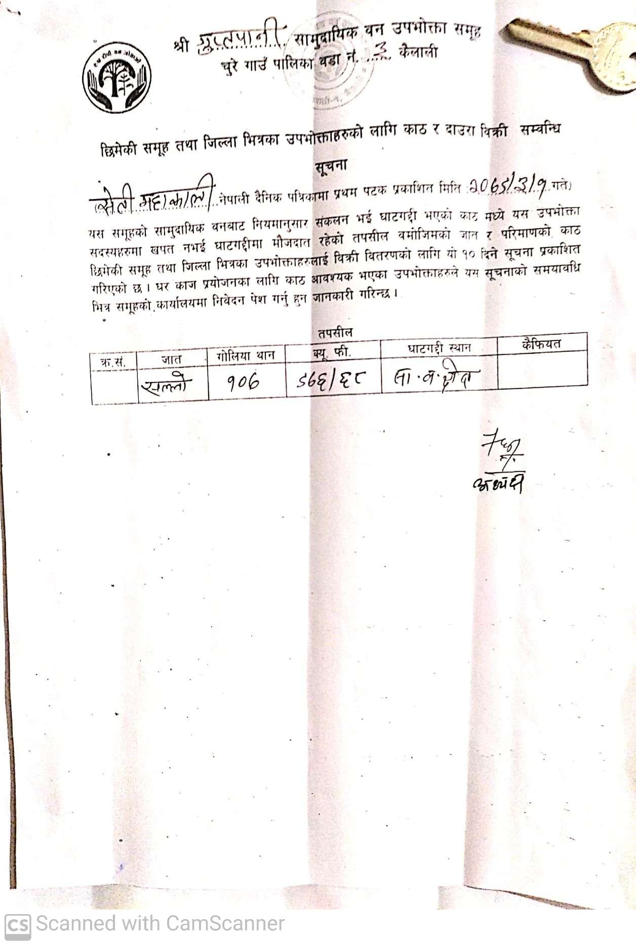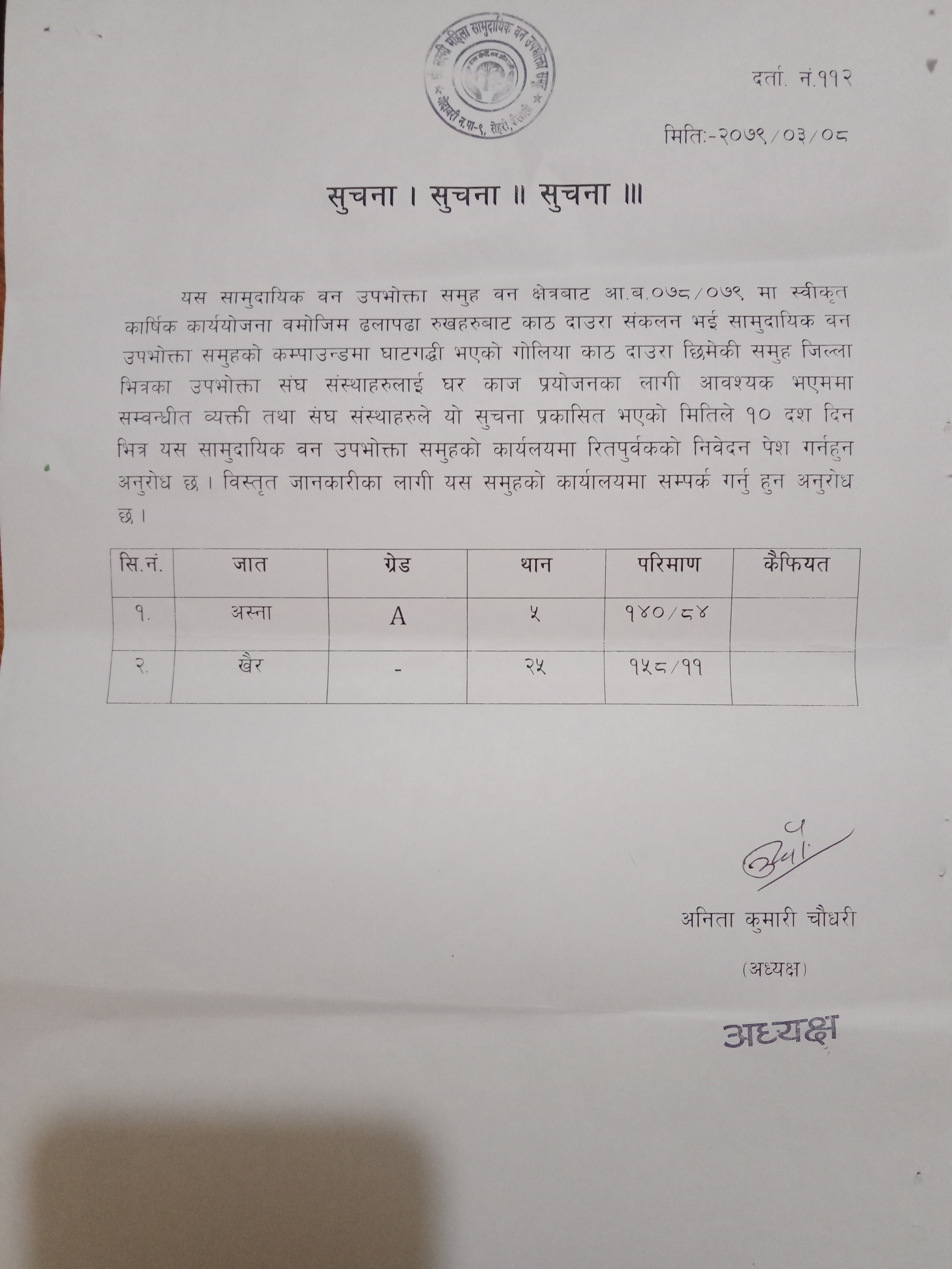 श्री गुप्तपानी सामुदायिक वन उपभोक्ता समूह चुरे कैलालीको सूचना ।