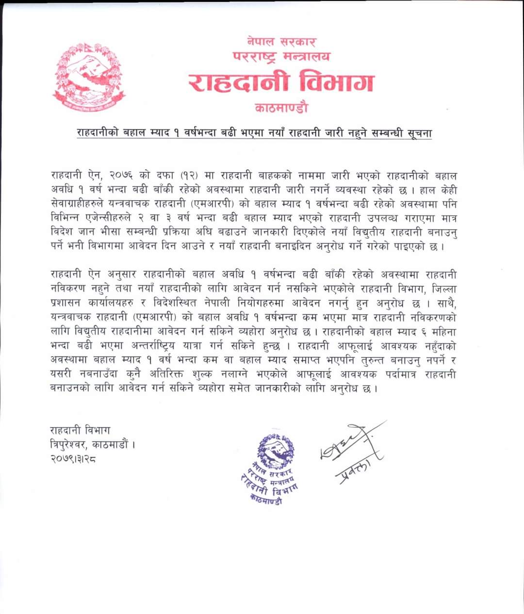 राहदानी बहाल म्याद १ वर्षभन्दा बढी भएमा नयाँ राहदानी जारी नहुने सम्बन्धी सूचना