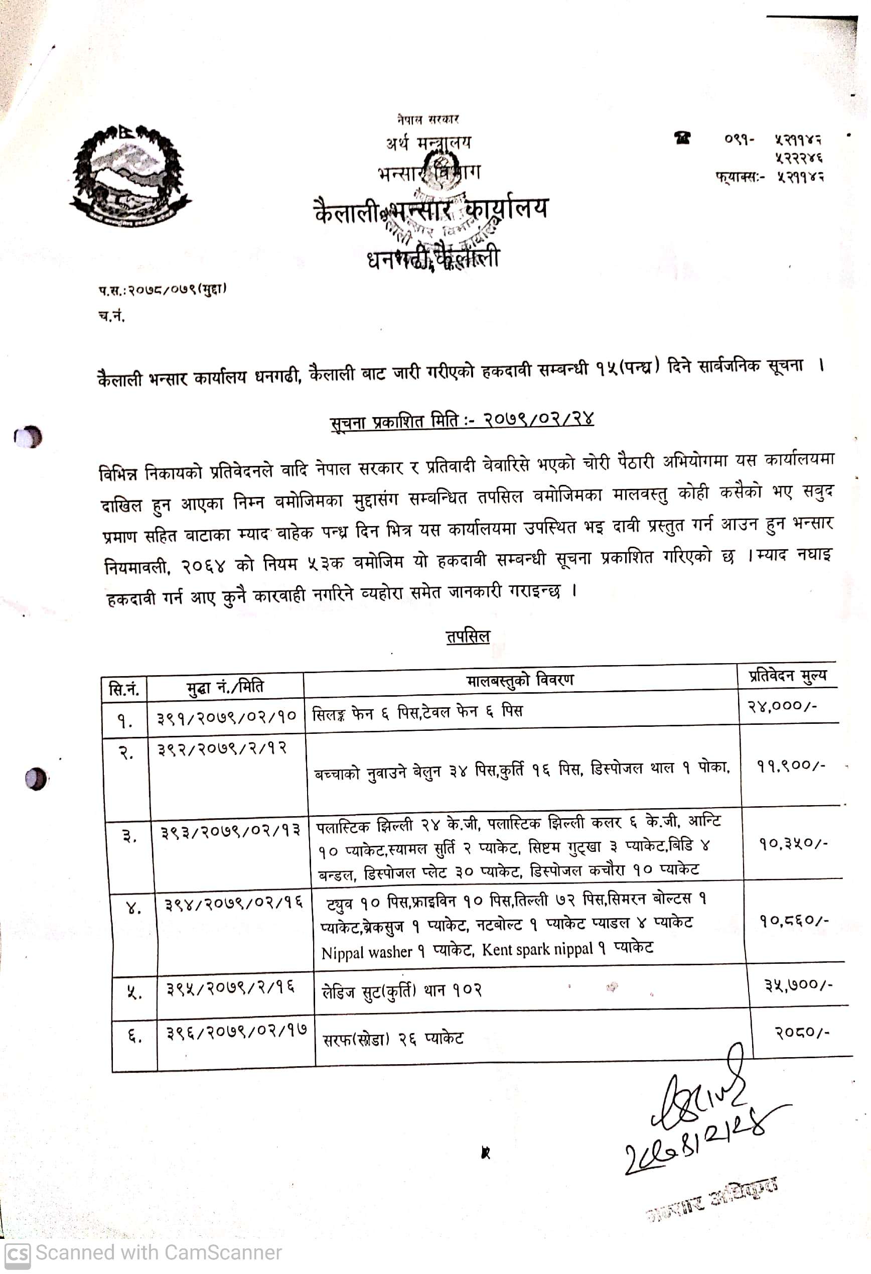 कैलाली भन्सार कार्यालयको हकदाबी सम्बन्धी सूचना ।