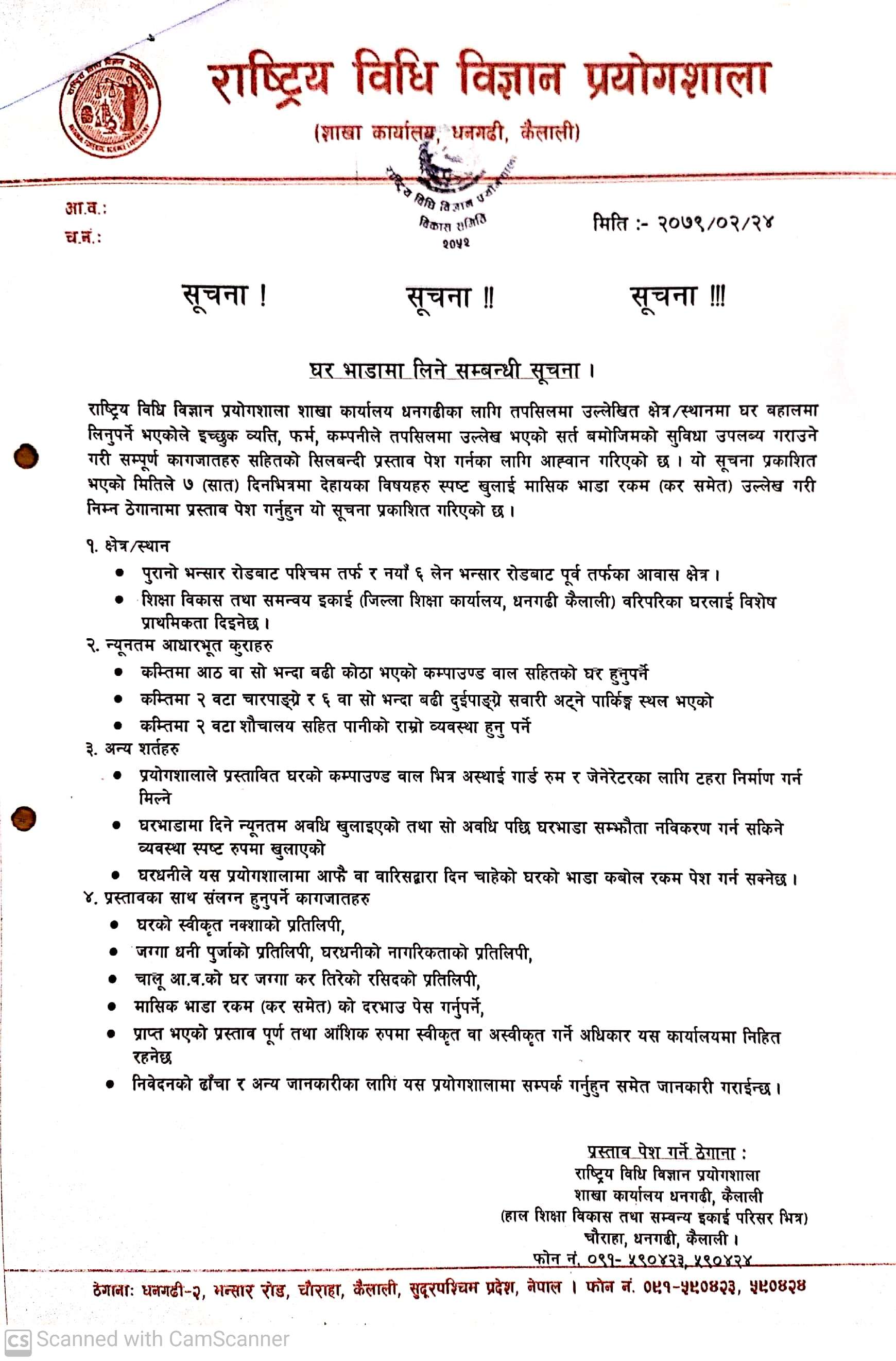 राष्ट्रिय बिधि विज्ञान प्रयोगशाला धनगढीको घरभाडाको सूचना ।