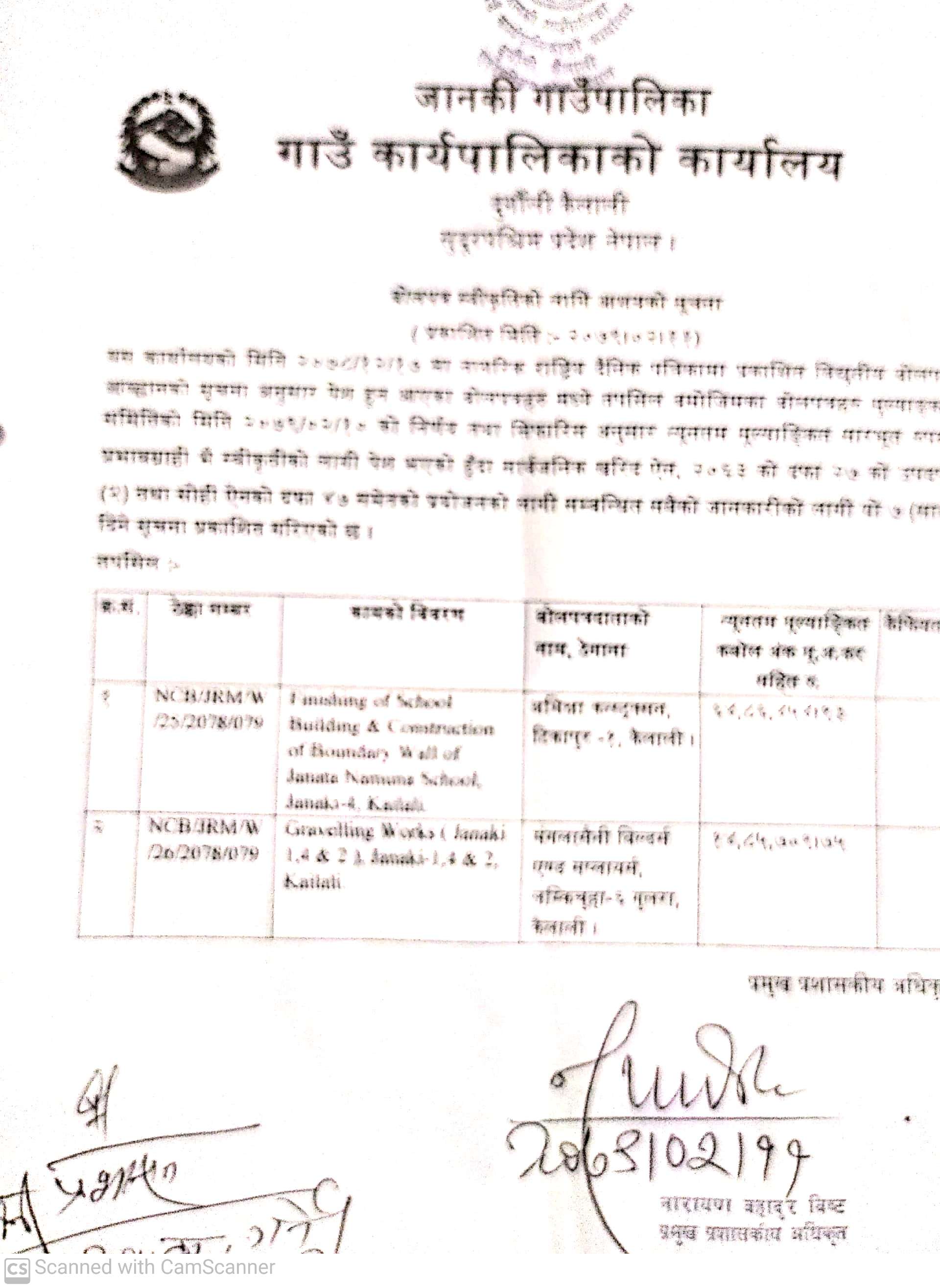 जानकी गाउँपालिकाको बोलपत्र स्वीकृतिको आशयको सूचना ।