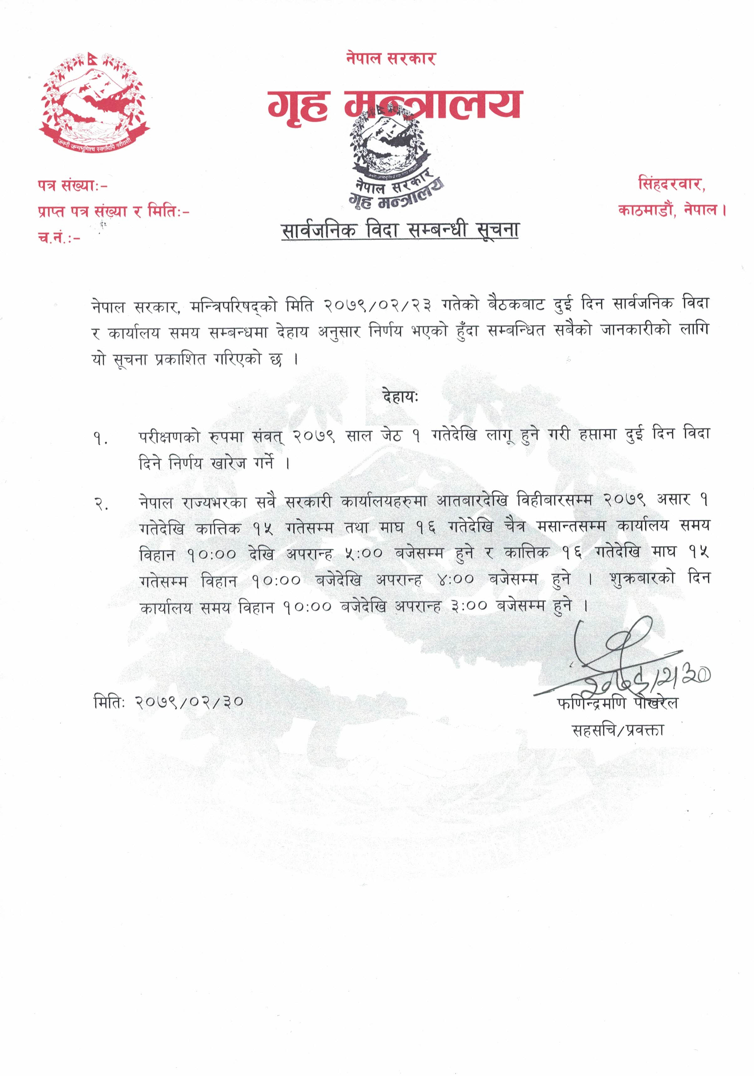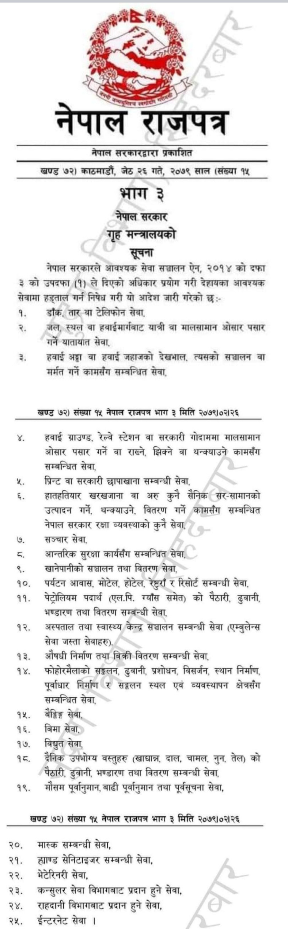 अत्यावश्यक सेवामा हड़ताल गर्न निषेध सम्बन्धि मिति h२०७९।०२।२६ काे सूचना