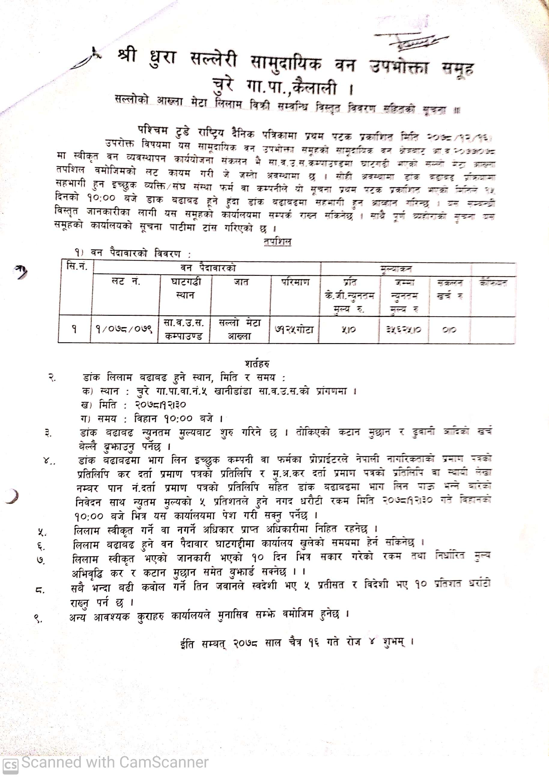 श्री धुरा सल्लेरी सामुदायक वन उपभोक्त समूह, चुरे कैलालीको सूचना ।