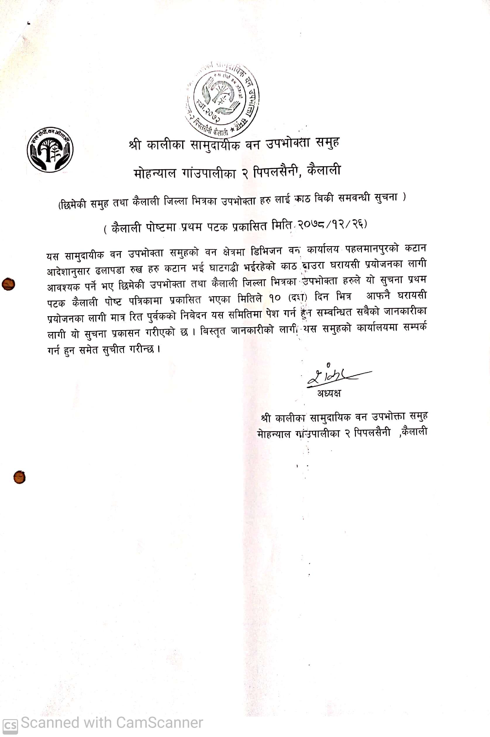 श्री कालीका सामुदायिक वन उपभोक्ता समूह मोहन्याल कैलालीको सूचना ।