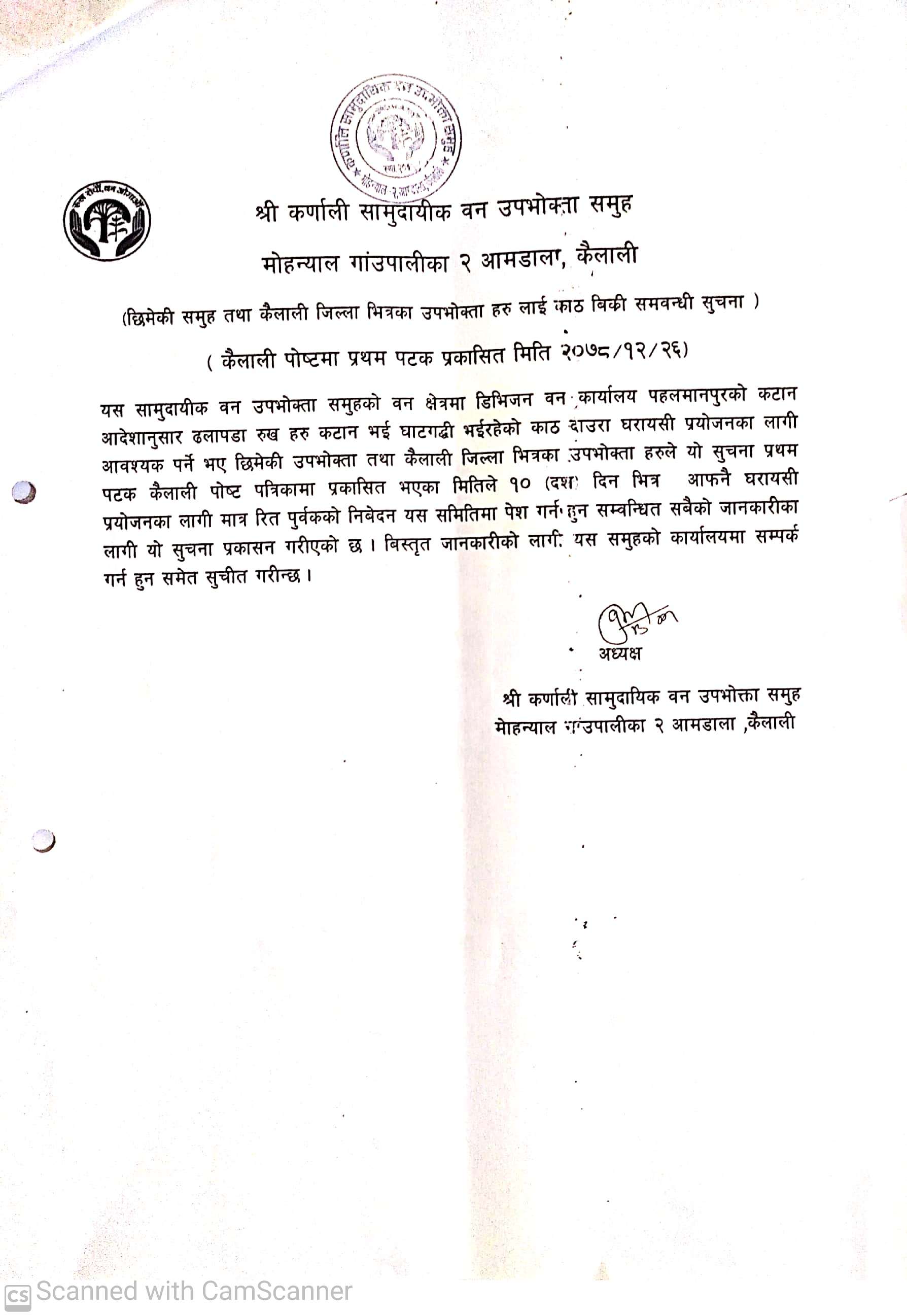 श्री कर्णाली सामुदायिक वन उपभोक्ता समूह मोहन्याल कैलालीको सूचना ।