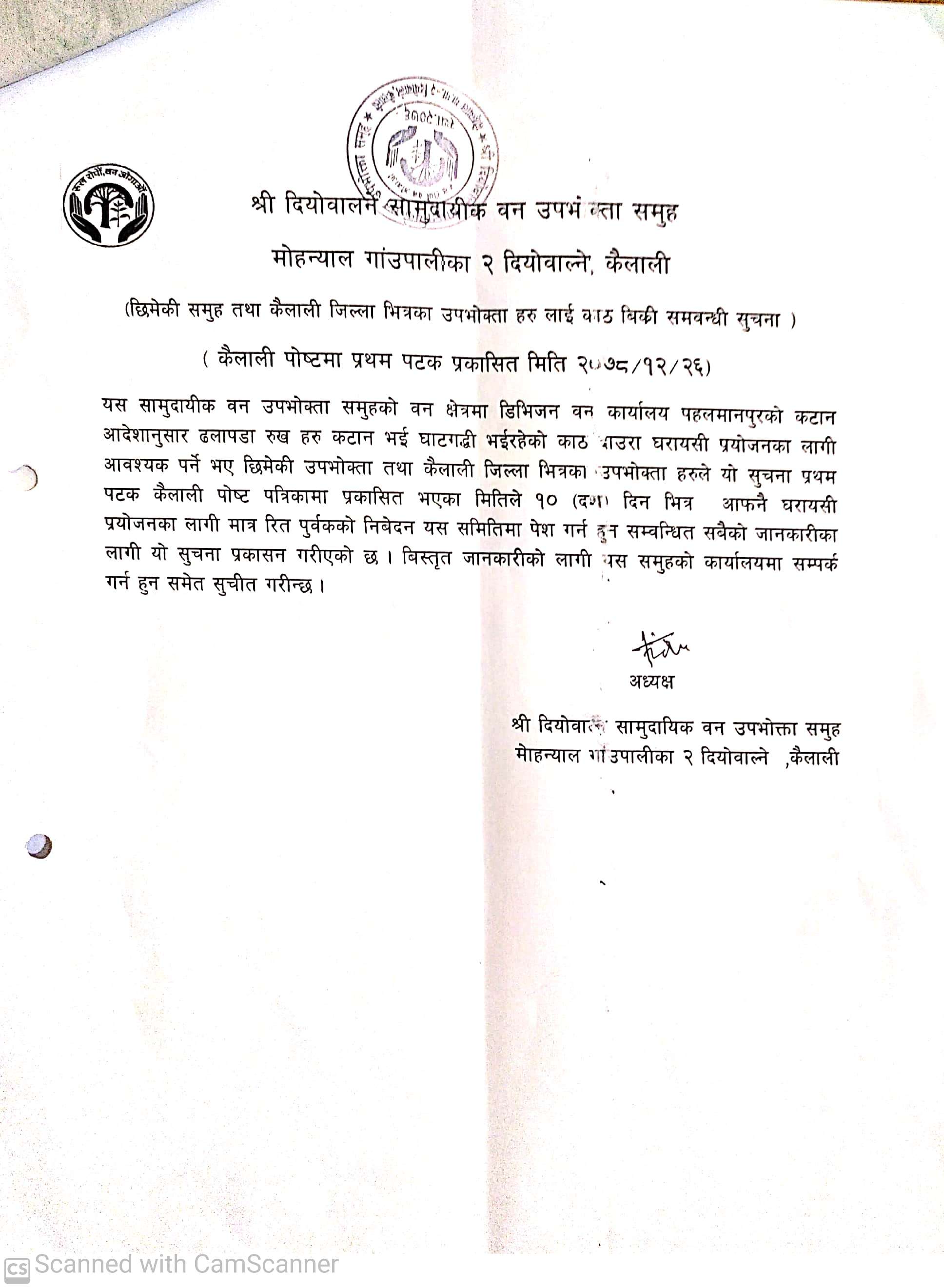 श्री दीयोबालने सामुदायिक वन उपभोक्ता समूह मोहन्याल कैलालीको सूचना ।