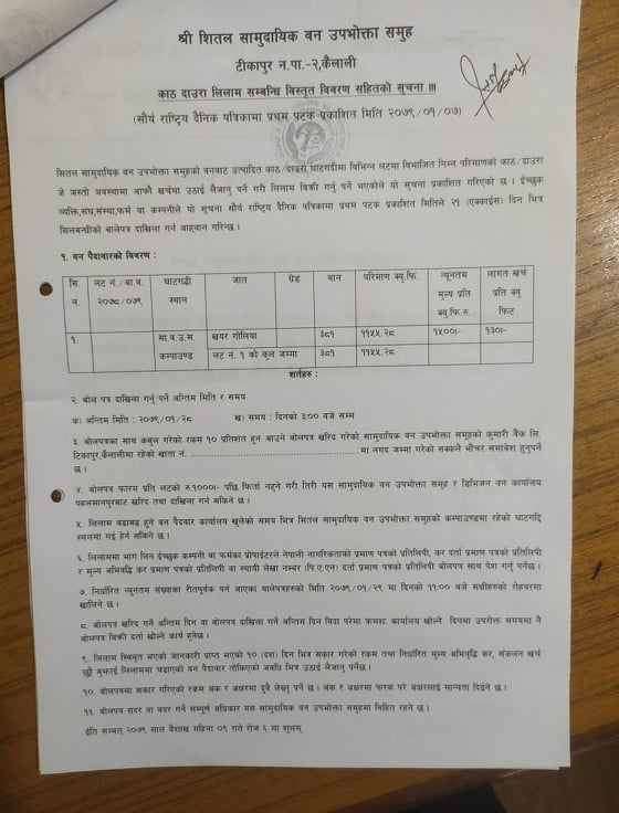 श्री ओम शान्ति सामुदायिक वन उपभोक्ता समूह, मोहन्याल कैलालीको काठ लिलामको सूचना ।