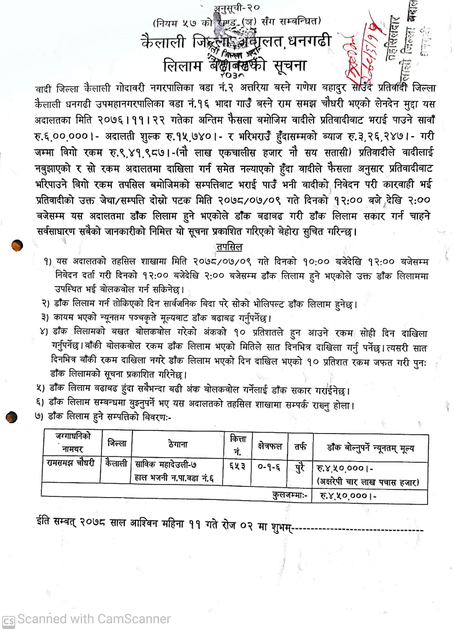 कैलाली जिल्ला अदालत धनगढीको लिलाम बढाबढको सूचना ।