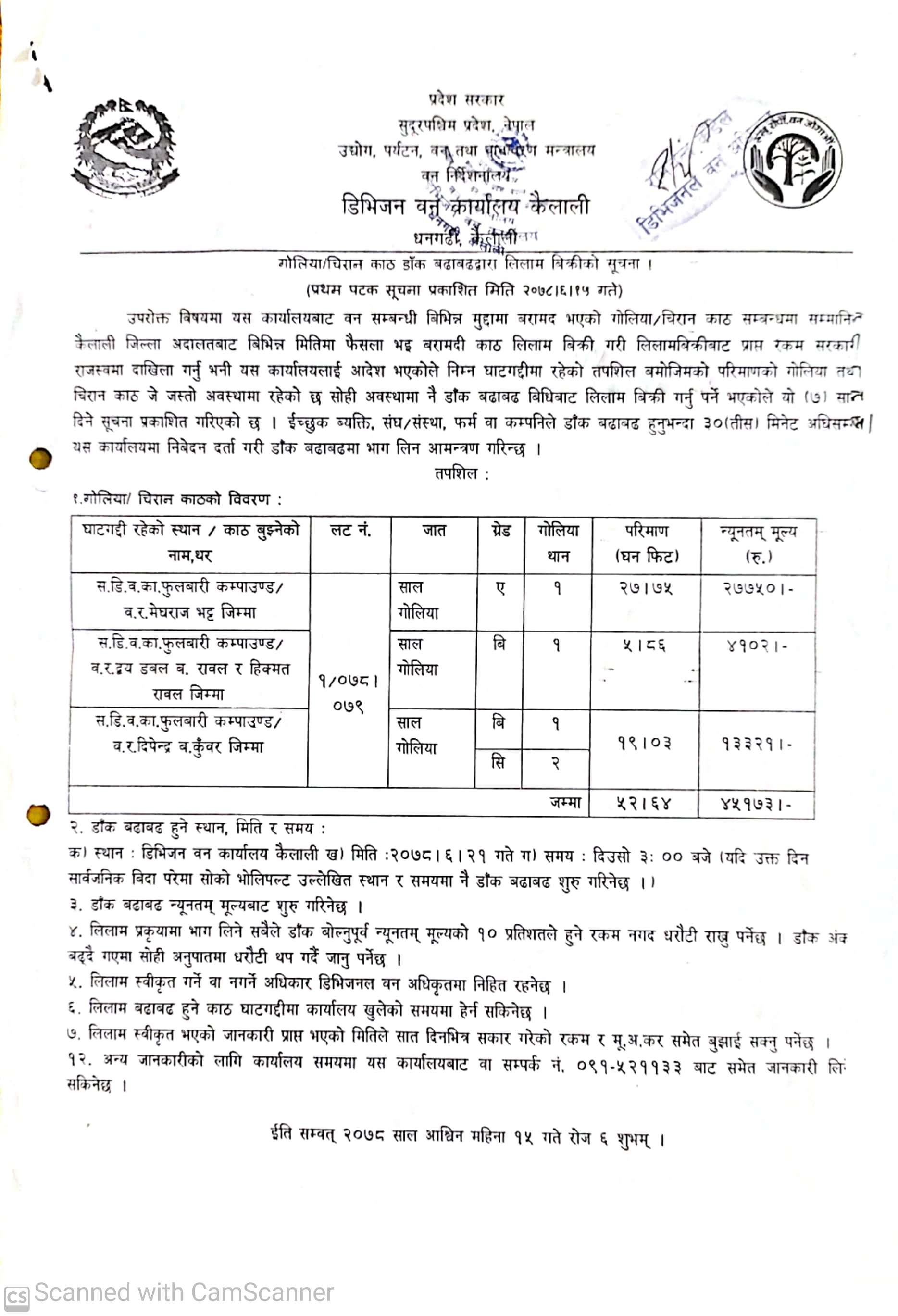 डिभिजन वन कार्यालय धनगढी, कैलालीको काठ लिलाम बिक्रीको सूचना ।