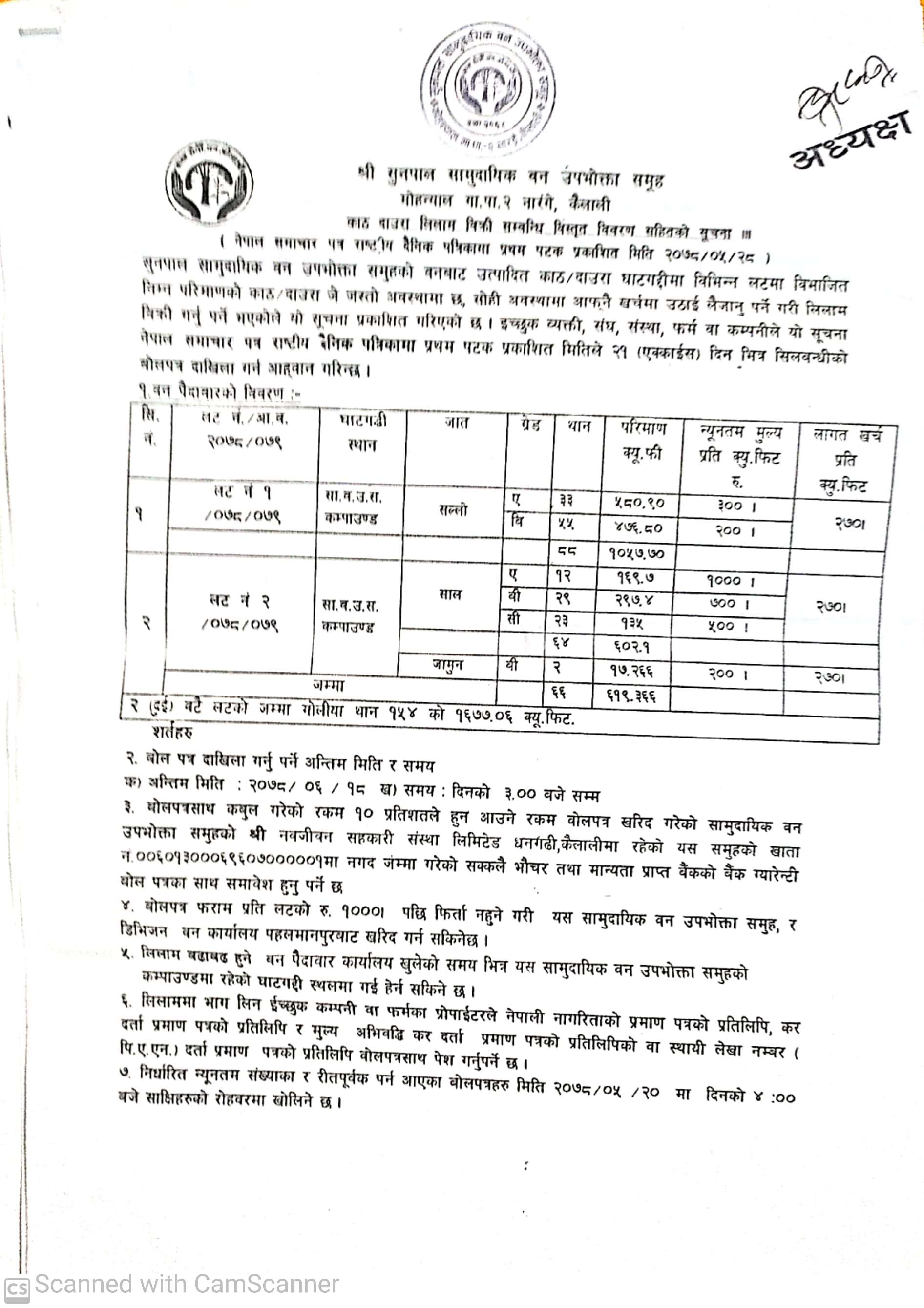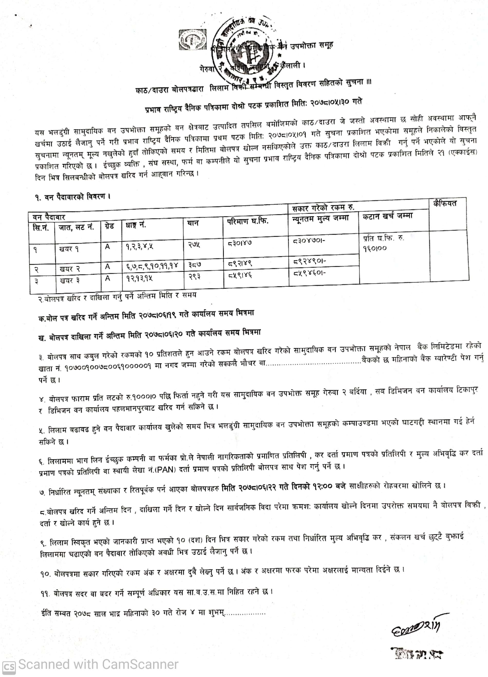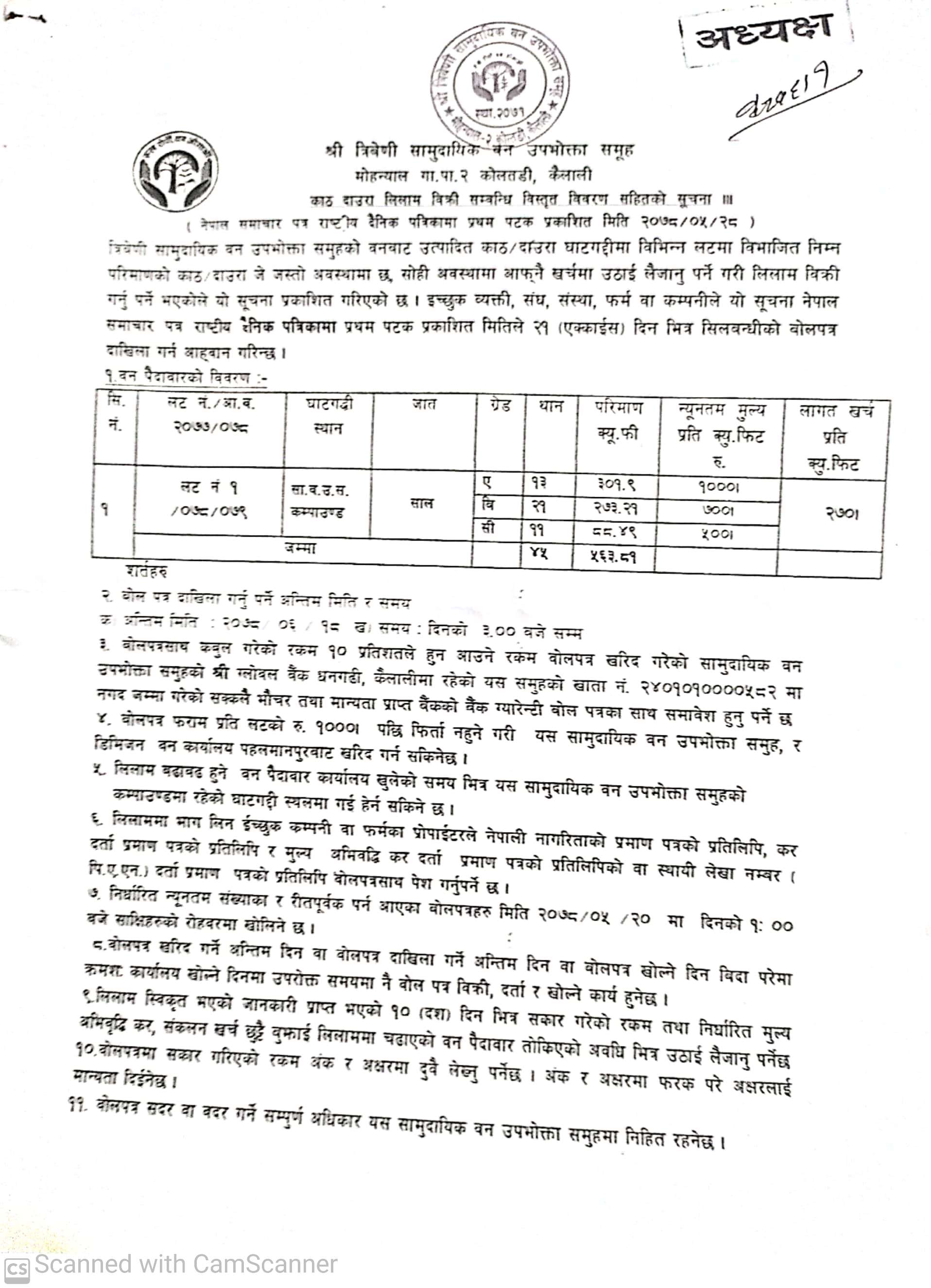 सिद्ध प्रगतिशिल सामुदायिक वन उपभोक्ता समूह, चुरे गा.पा.कैलालीको काठ लिलामको सूचना ।