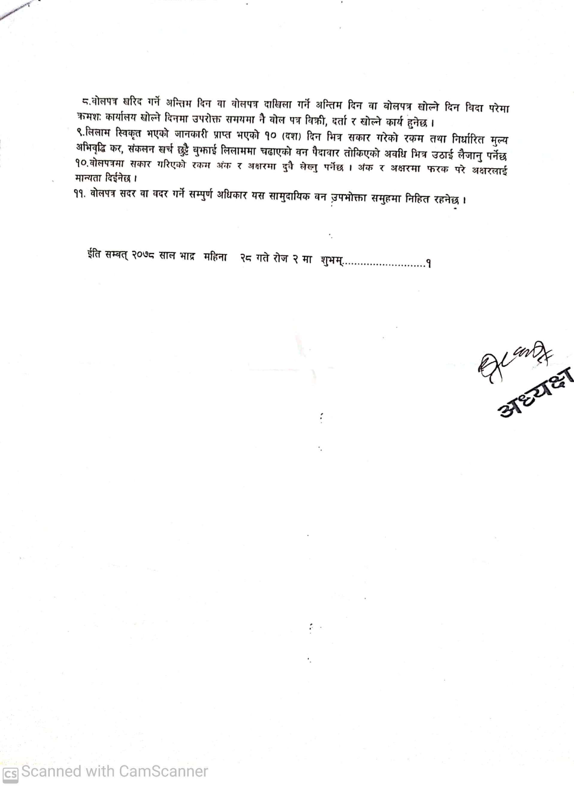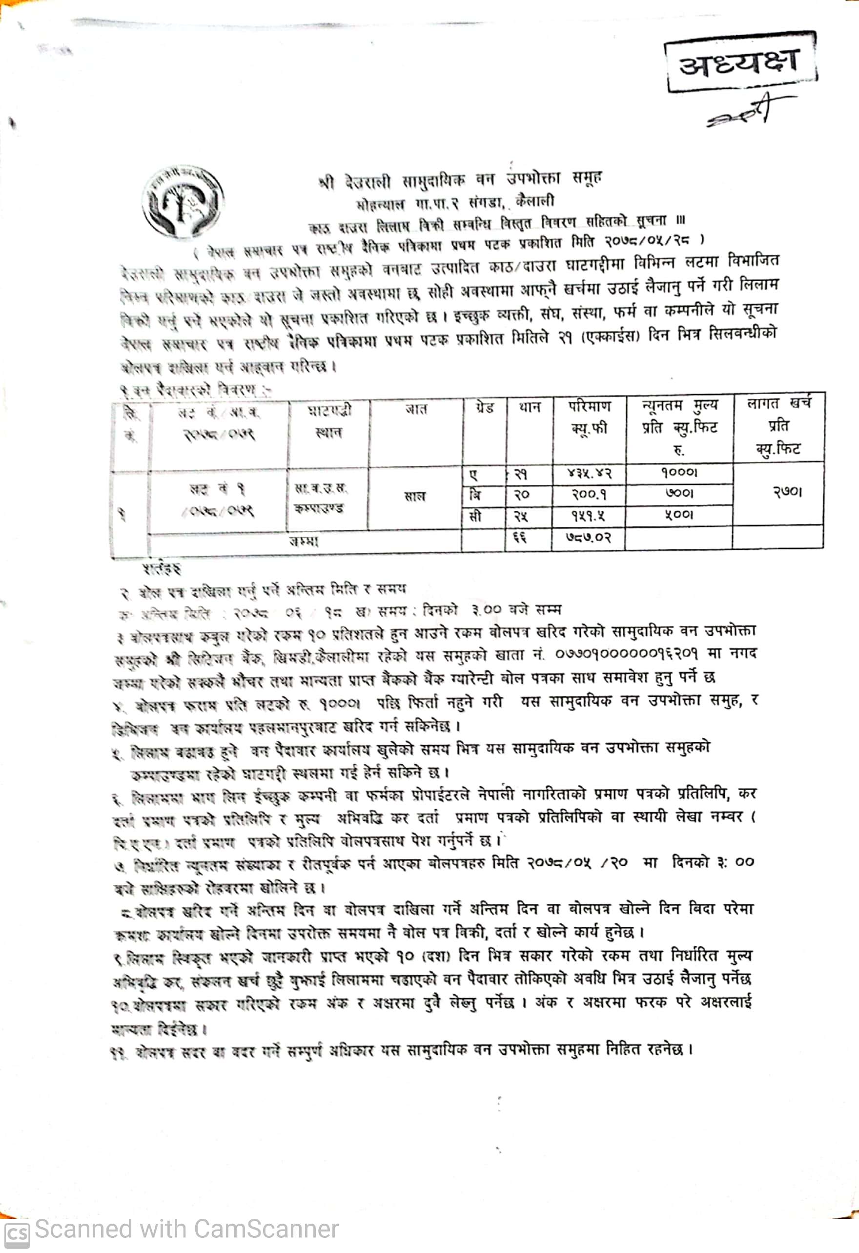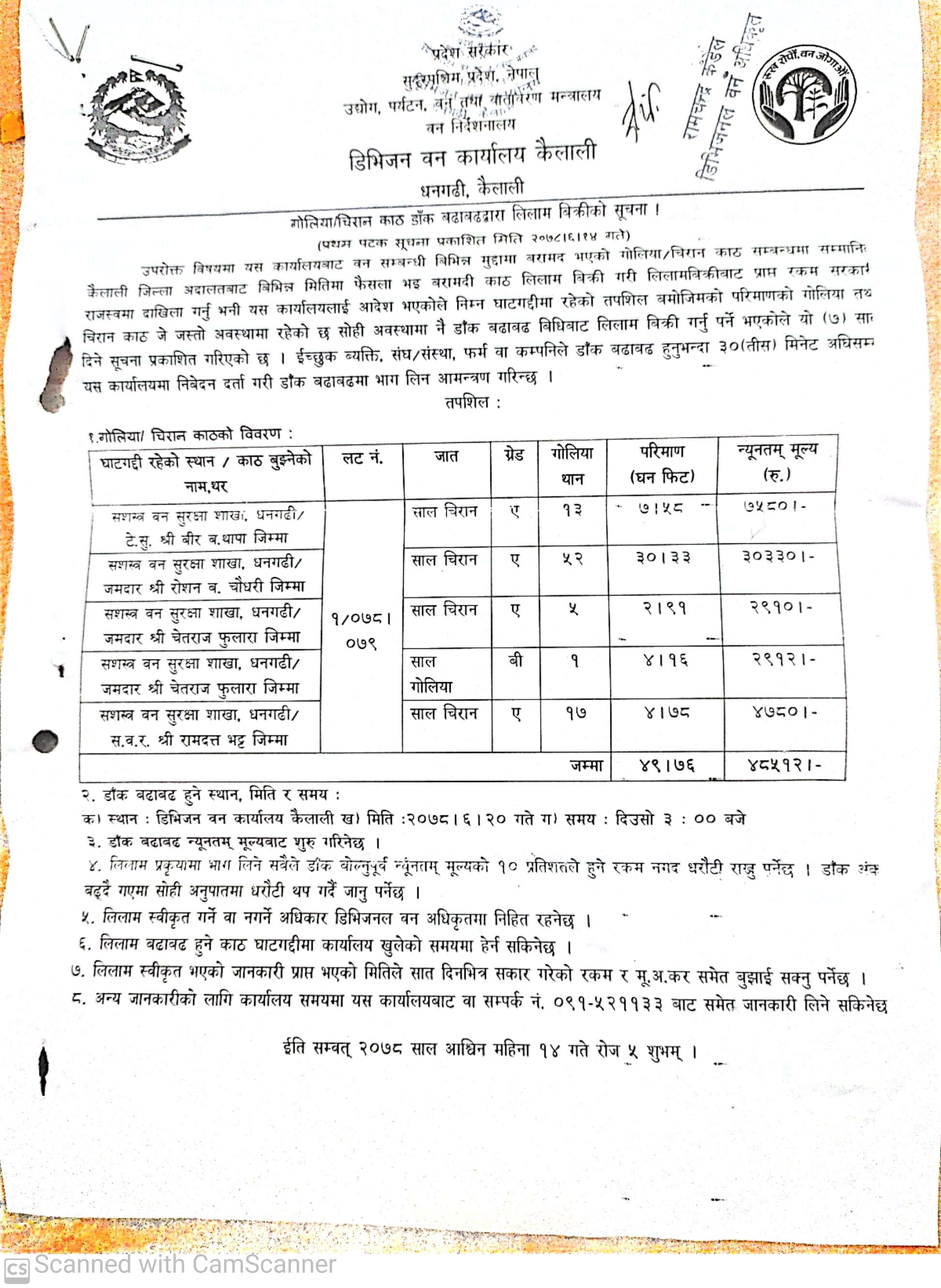 सिद्ध प्रगतिशिल सामुदायिक वन उपभोक्ता समूह, चुरे गा.पा.कैलालीको काठ लिलामको सूचना ।