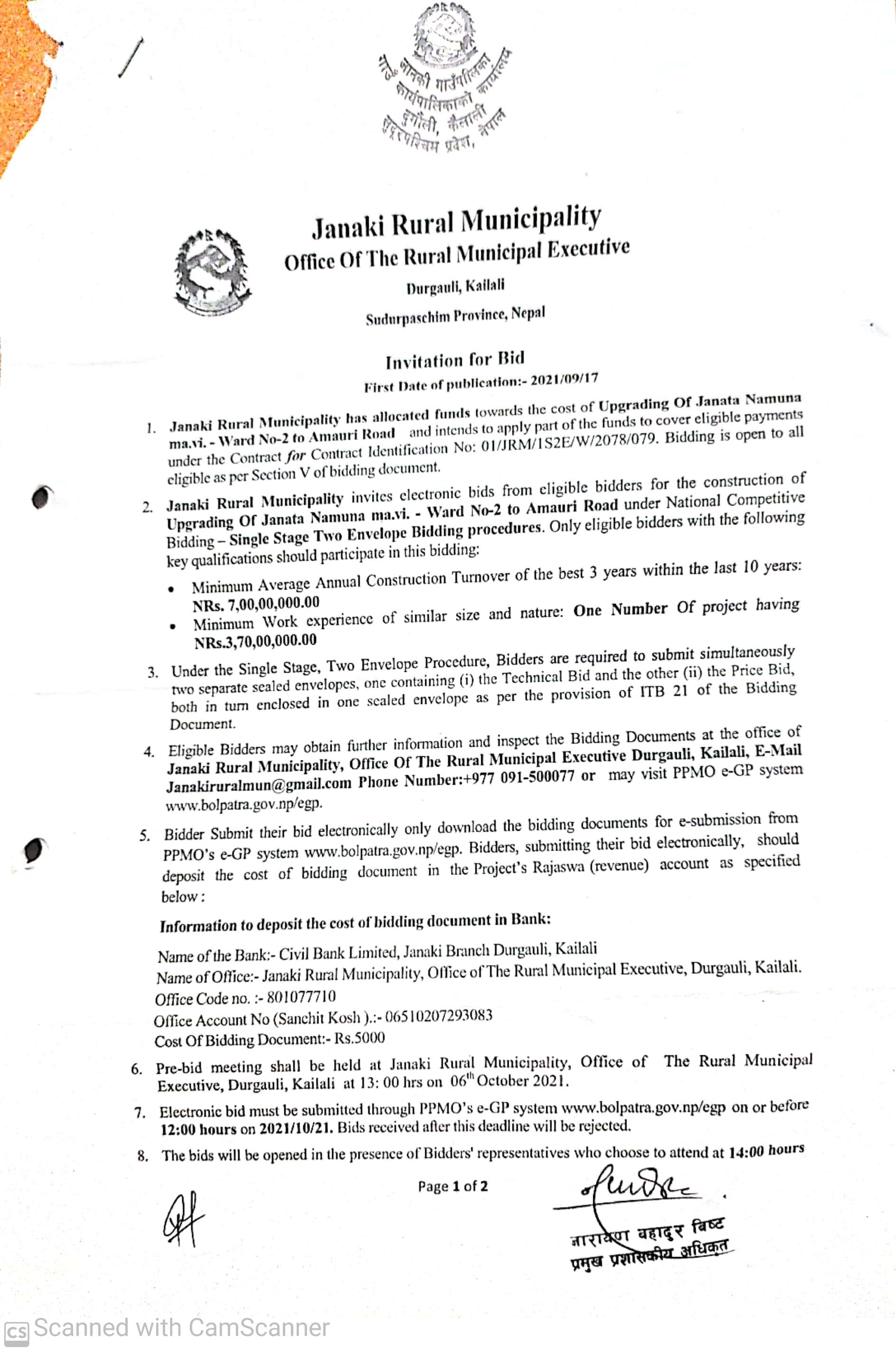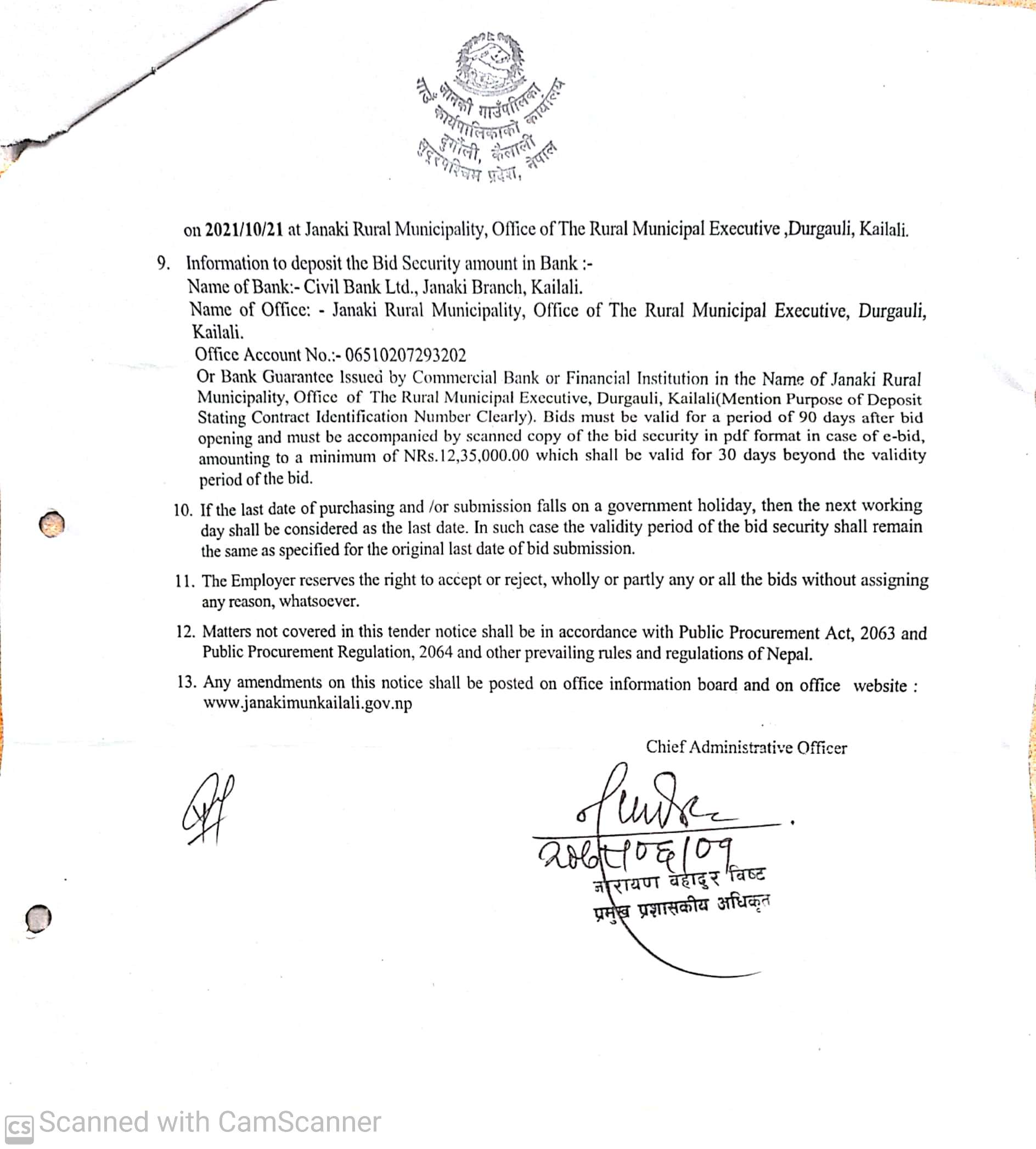 जानकी गाउँपाालिका कैलालीको बिडिङ सम्बन्धि सूचना ।