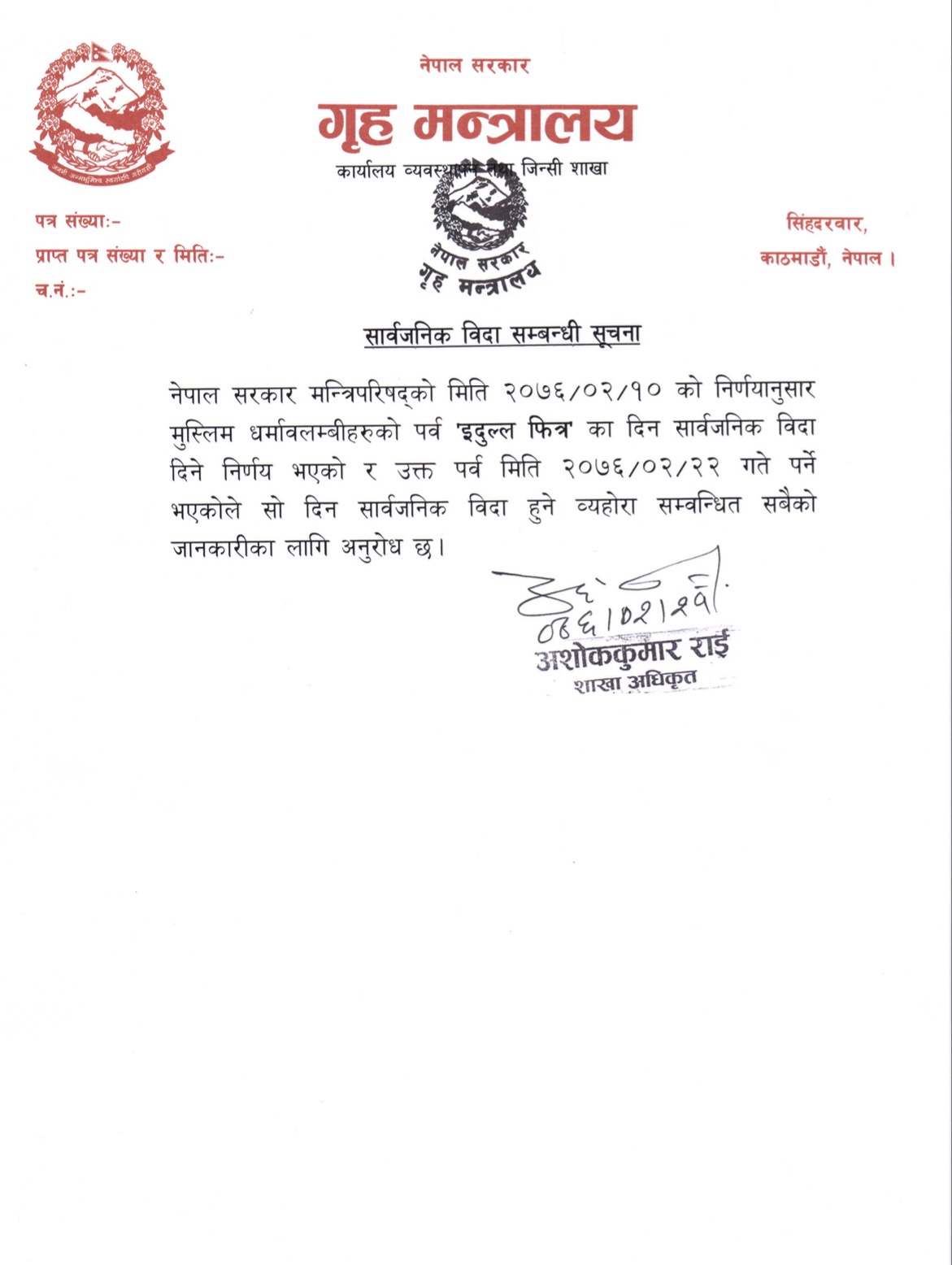 बि.सं. २०७७ सालको सार्वजनिक, पर्व एवं सट्टा बिदा र कार्यालय समय निर्धारण सम्वन्धी सूचना ।