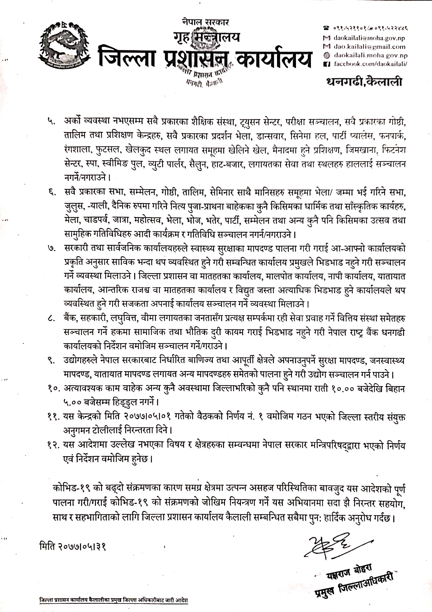 २०७७।०५।३१ गते प्रमुख जिल्ला अधिकारीबाट जारी आदेश