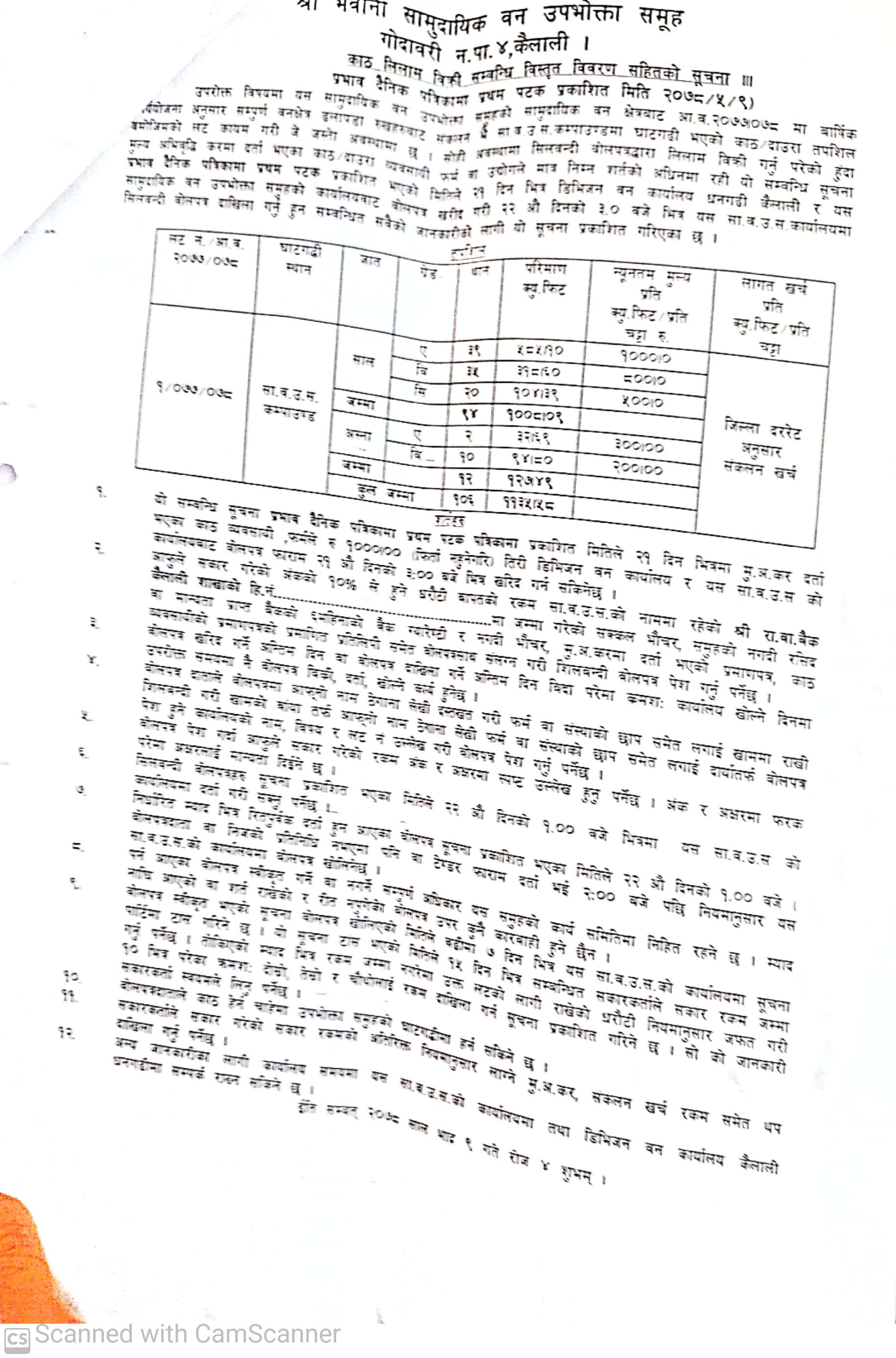 श्री सिद्ध भगवती सामुदायिक वन उपभोक्ता समूह गोदावरी कैलालीको काठ लिलाम बिक्रीको सूचना ।