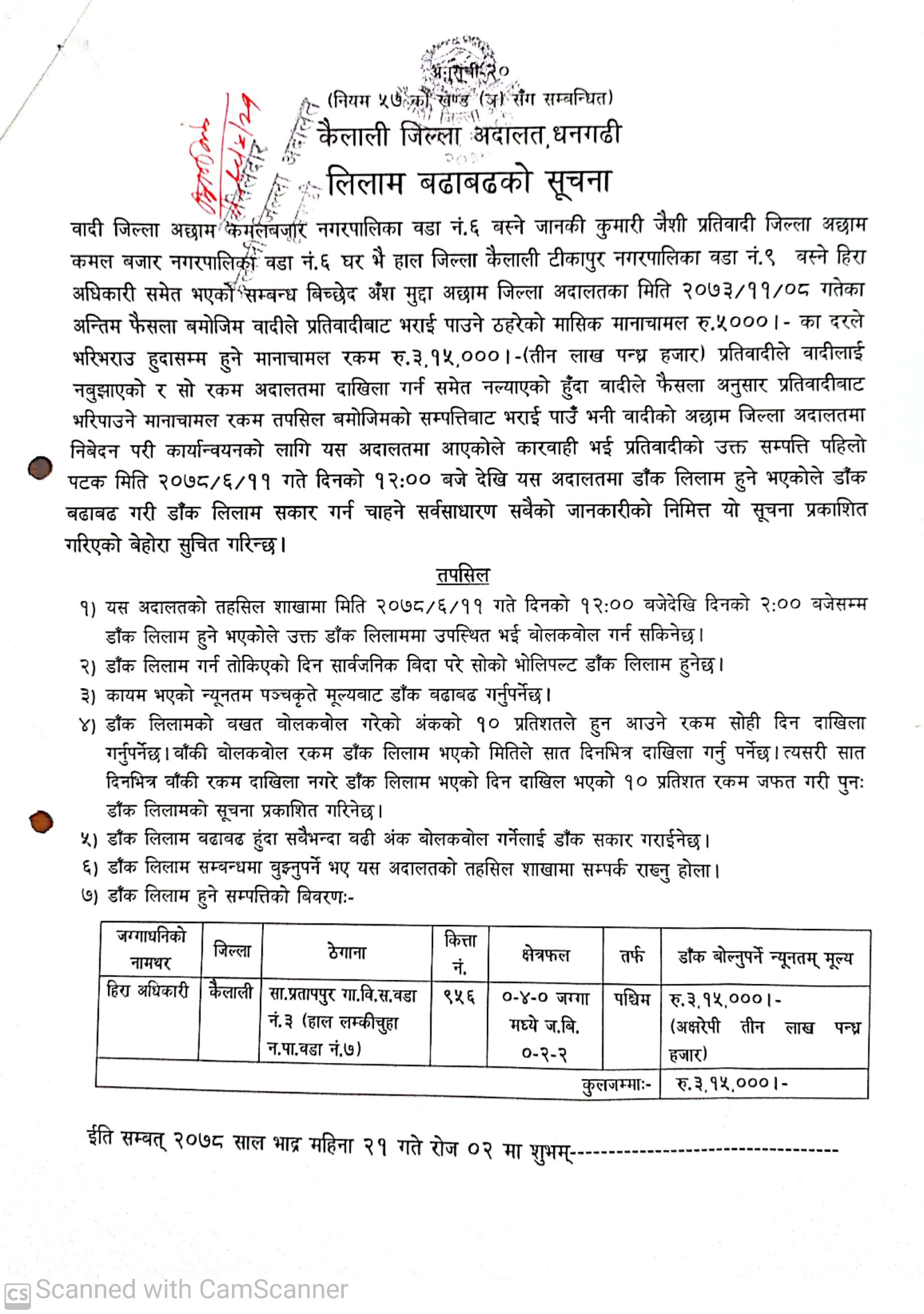 कैलाली जिल्ला अदालत धनगढीको लिलाम बढाबढको सूचना ।