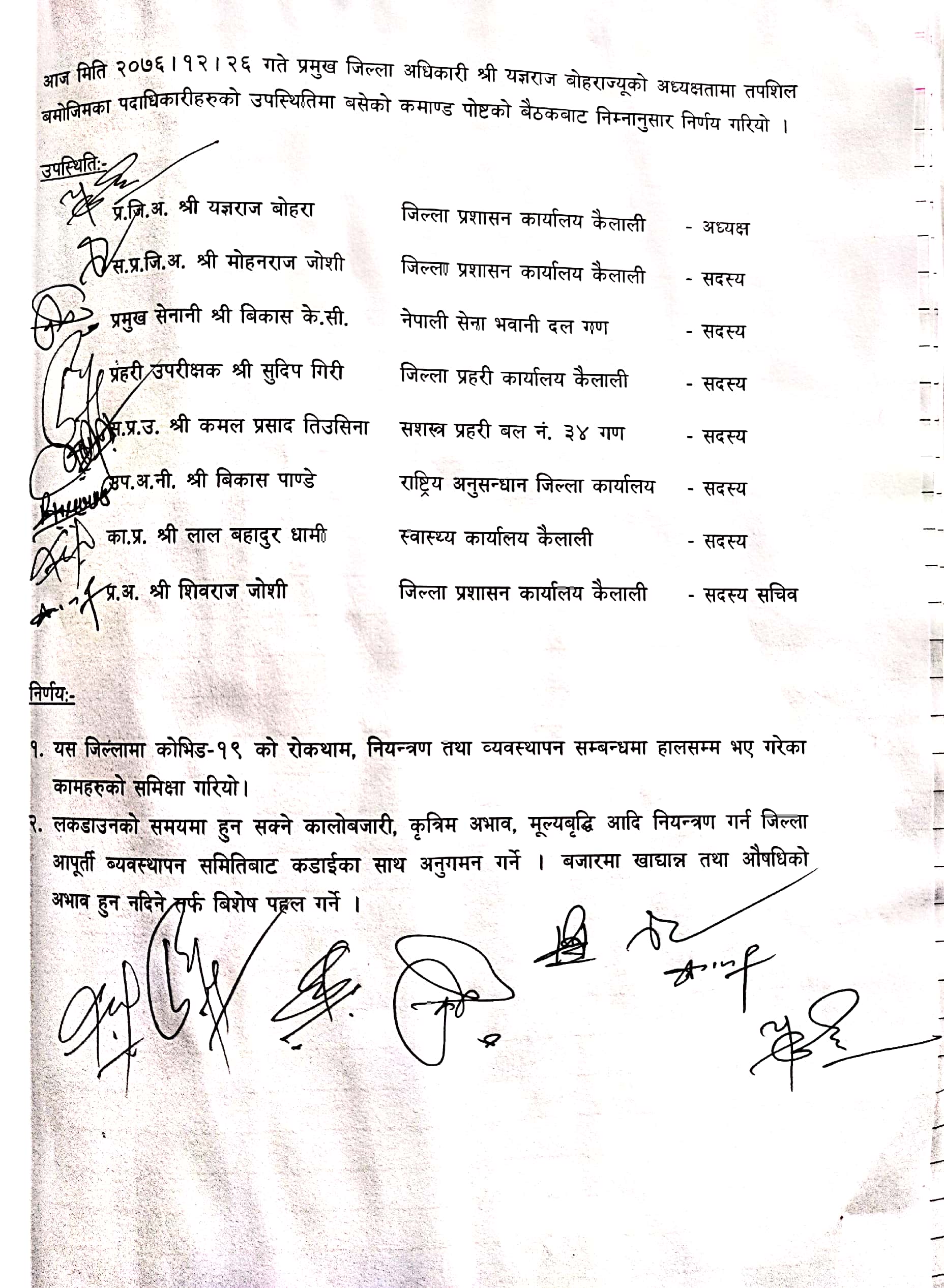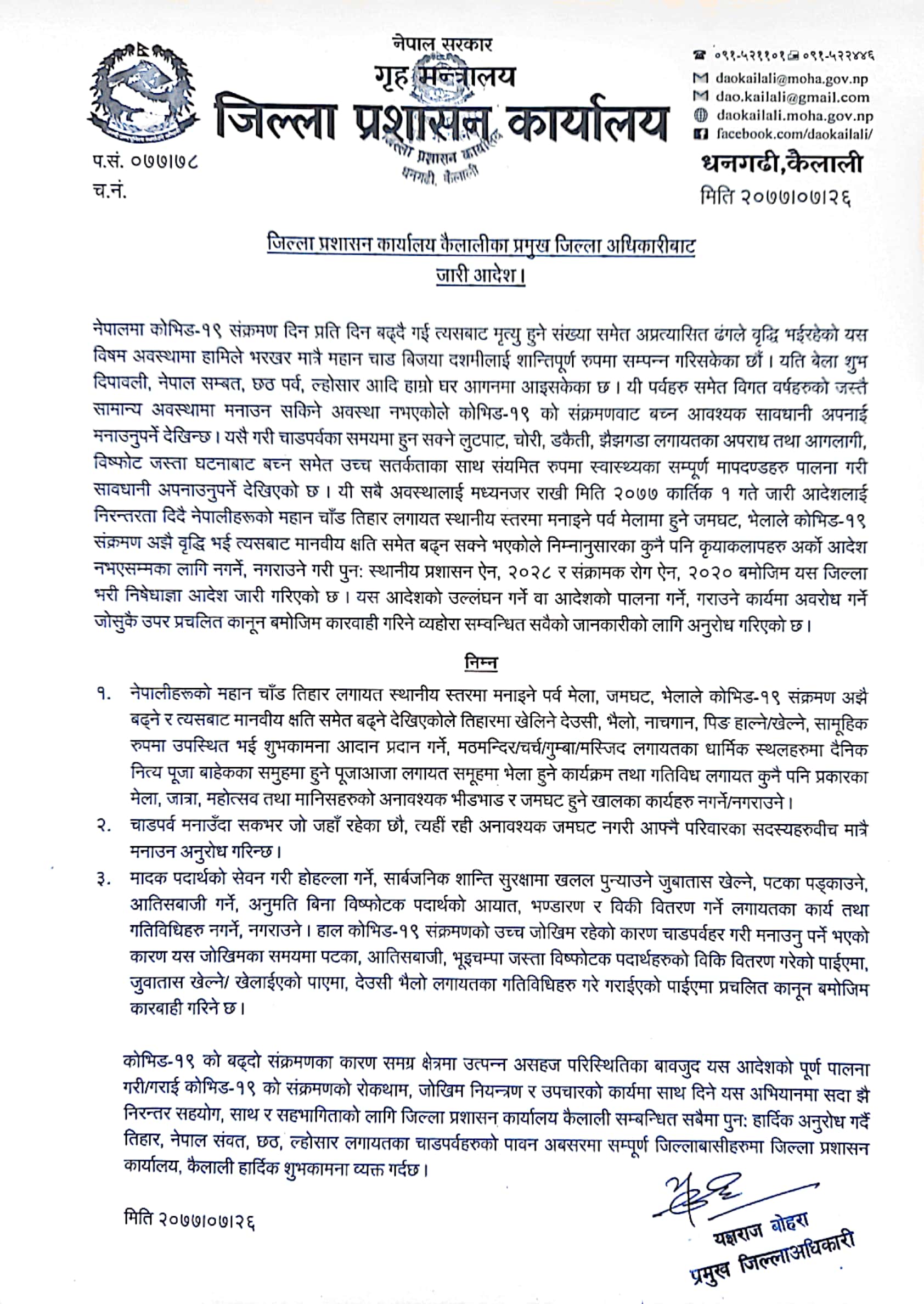 श्रीमान् प्रमुख जिल्ला अधिकारीज्यूबाट मिति २०७७।०७।२६ गते जारी आदेश
