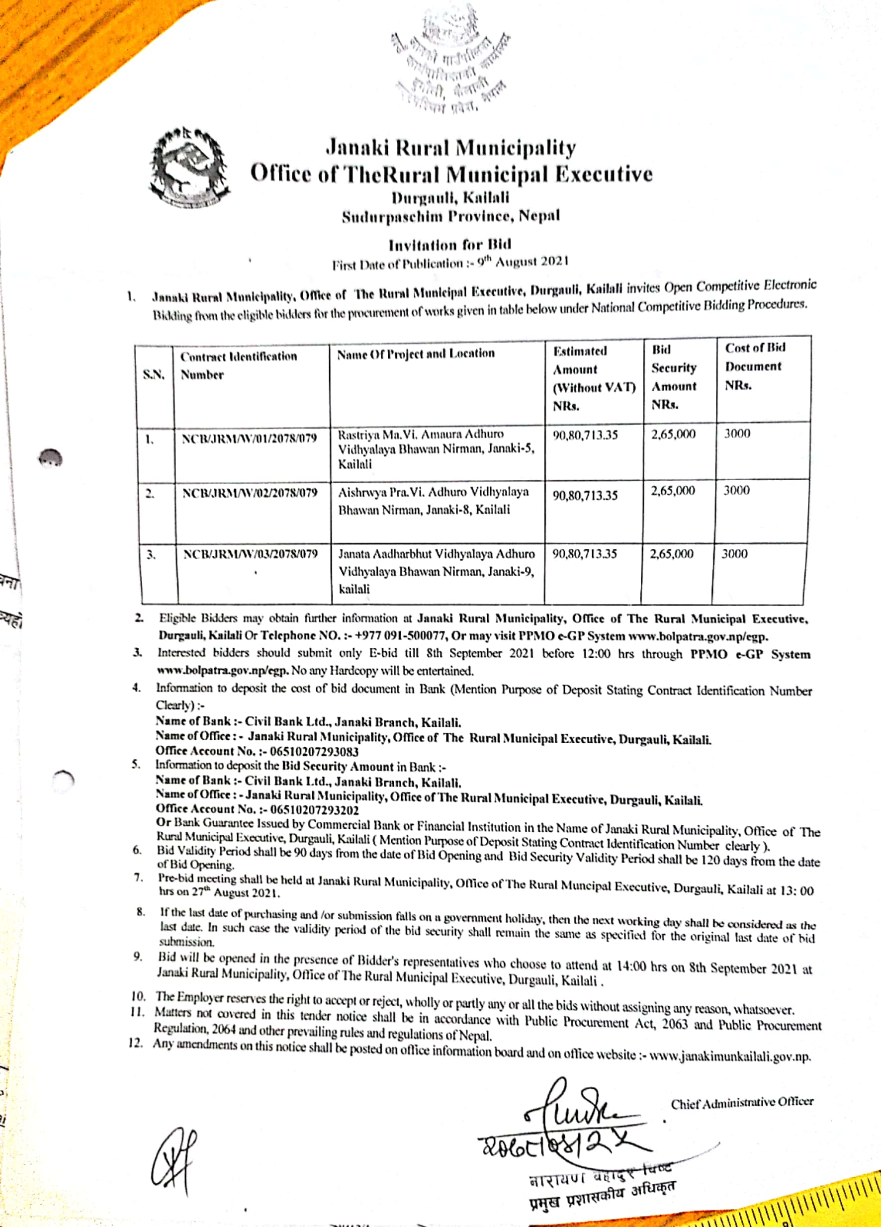 जानकी गाउँपालिका कैलालीको Invitation for Bid सम्बन्धी सूचना ।