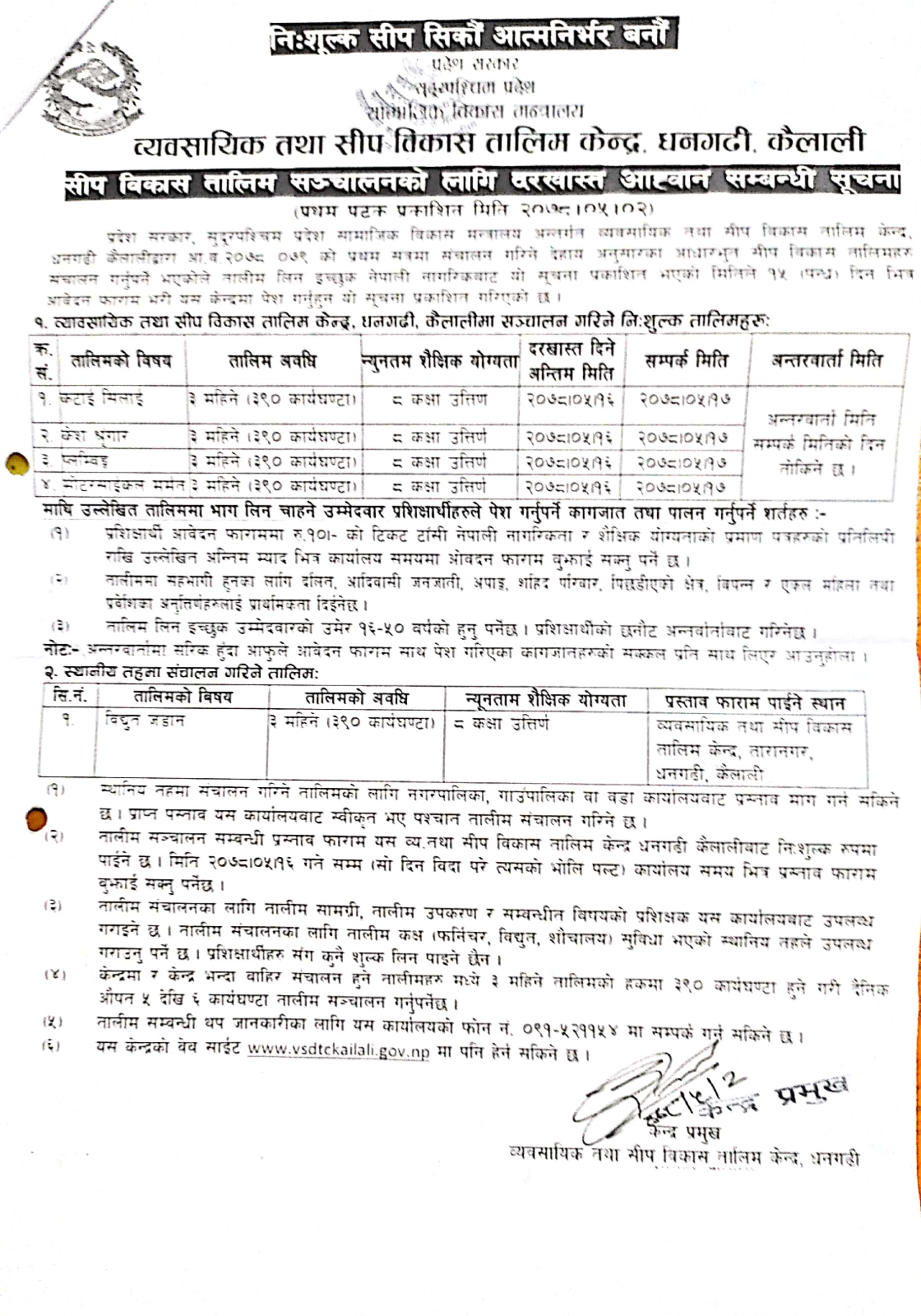 व्यावसायिक तथा सीप विकास तालिम केन्द्र धनगढीको दरखास्त आह्वानको सूचना ।