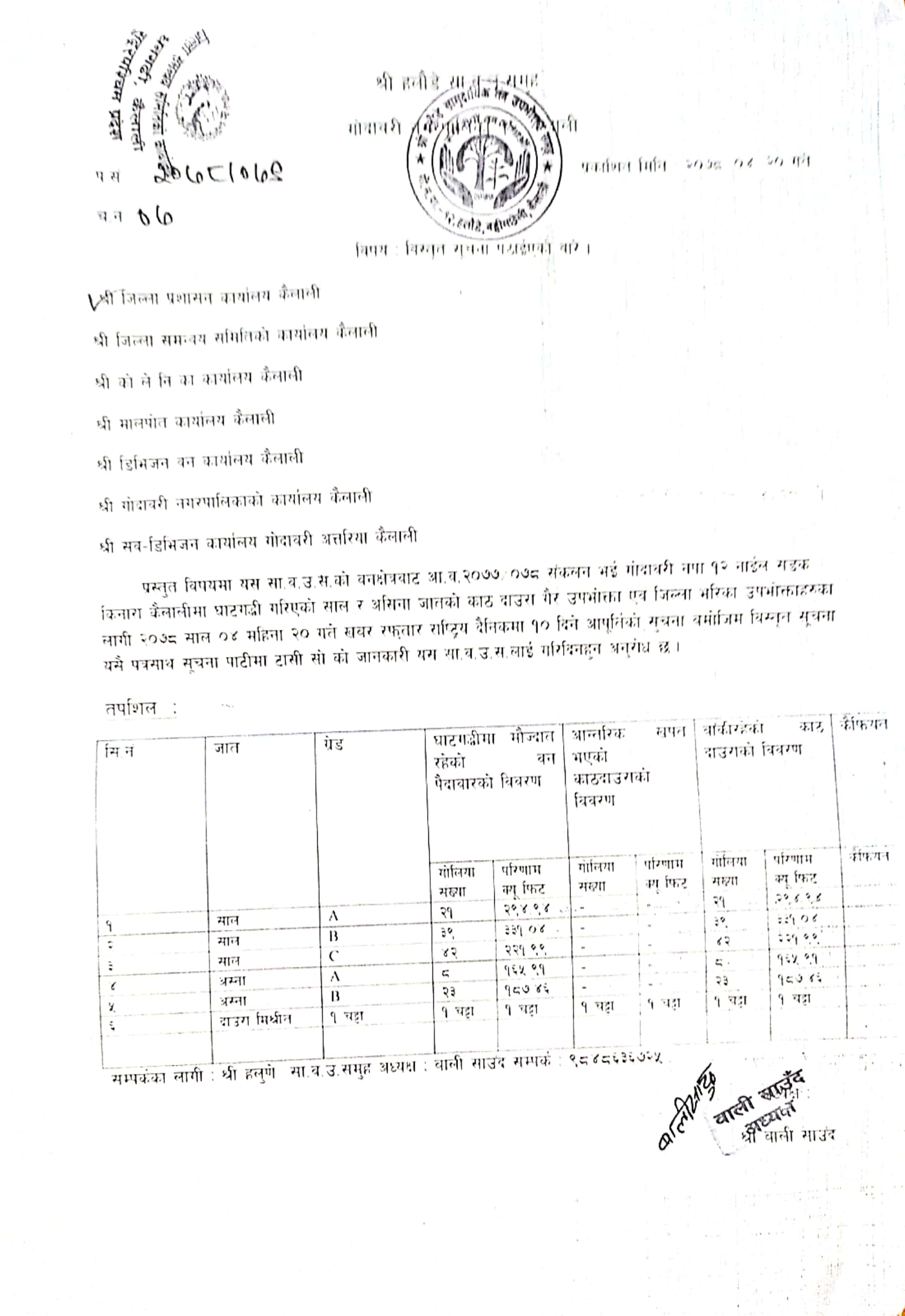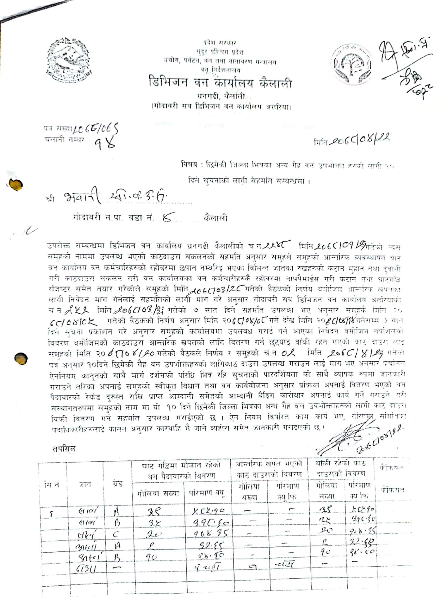 हलौडे सामुदायिक बन उपभोक्ता समुह, गोदावरी कैलालीको काठ आपूर्ति सम्बन्धी सूचना