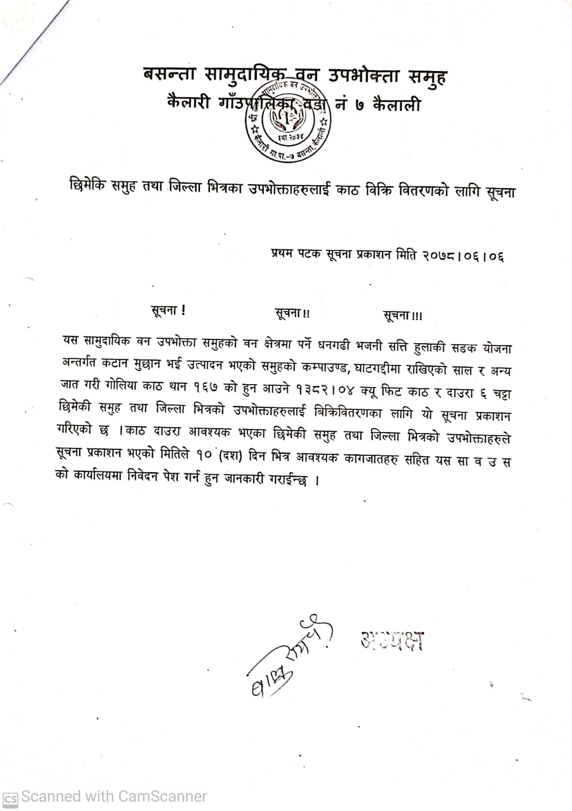 बसन्ता सामुदायिक वन उपभोक्ता समिति, कैलारी गा.पा. कैलालीको सूचना ।