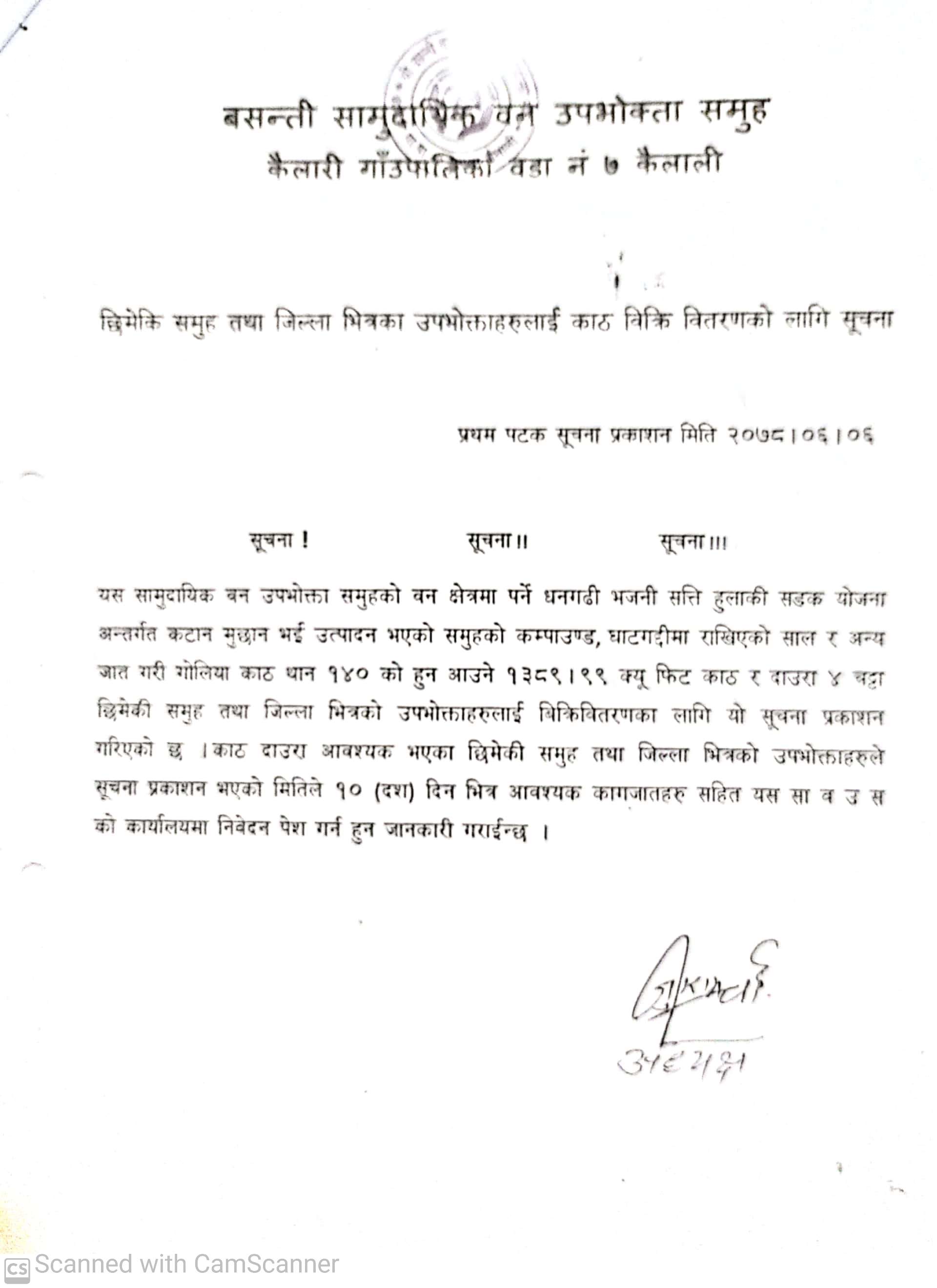 बसन्ती सामुदायिक वन उपभोक्ता समिति, कैलारी गा.पा. कैलालीको सूचना ।