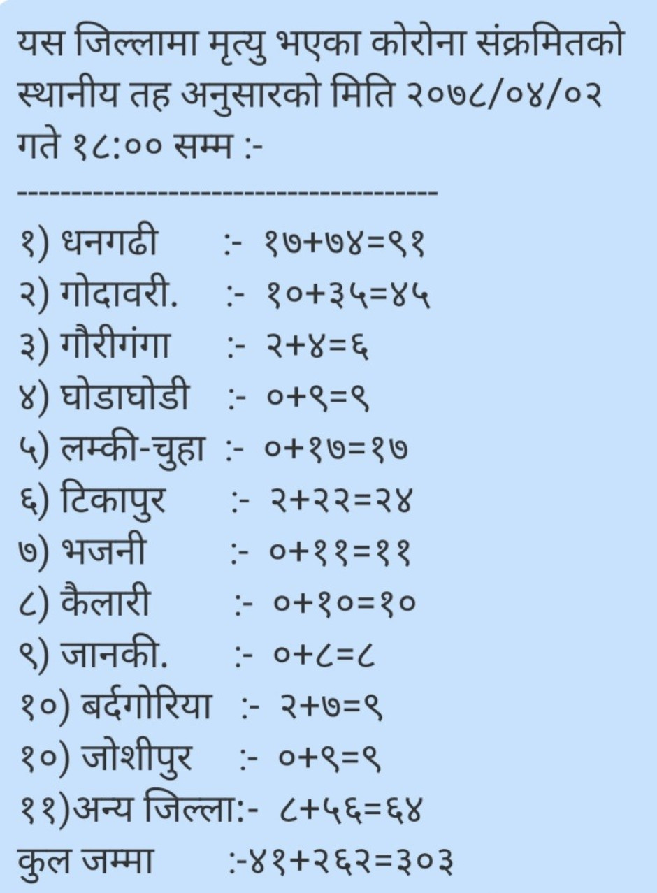 मिति २०७८/०४/०२गते डोकेबजार नाका हुँदै भारत बाट नेपाल प्रवेश गरेका नेपाली नागरिक हरु महिला =१११पुरुष =२६२बालबालिका =६२गरि जम्मा =४३५जना नेपाल बाट भारत गएका नेपाली नागरिक हरु महिला =६५७पुरुष =१४३९बालबालिका =३६६गरि जम्मा =२४६२जना र भारतिय महिला= ३५पुरुष = ३५बालबालिका =१५गरि ८५जम्मा antigen जम्मा परिक्षण १३३ पाेजेटिभ १