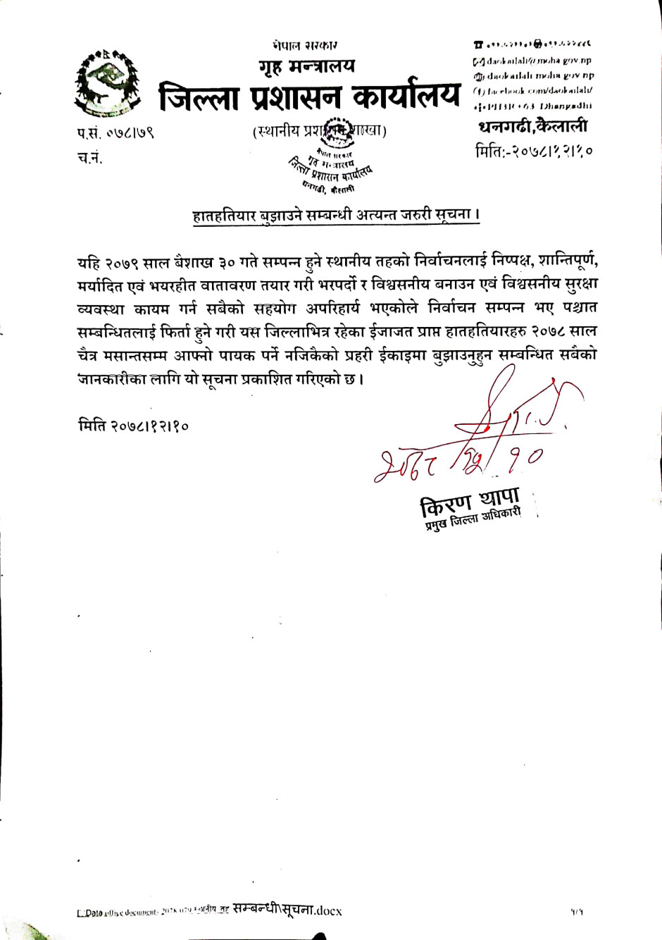 हातहतियार बुझाउने सम्बन्धि सूचना