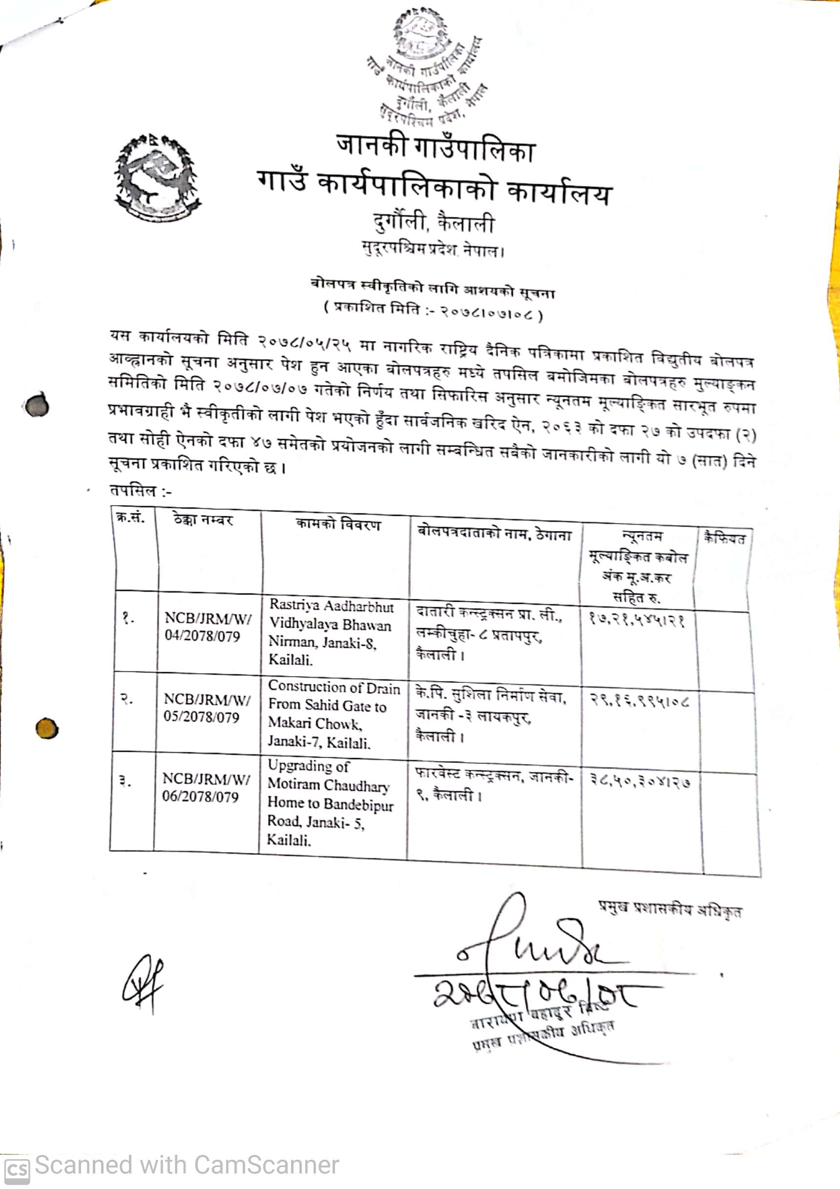 जानकी गाउँपालिका कैलालीको बोलपत्र स्वीकृतिको लागि आशय सम्बन्धी सूचना ।