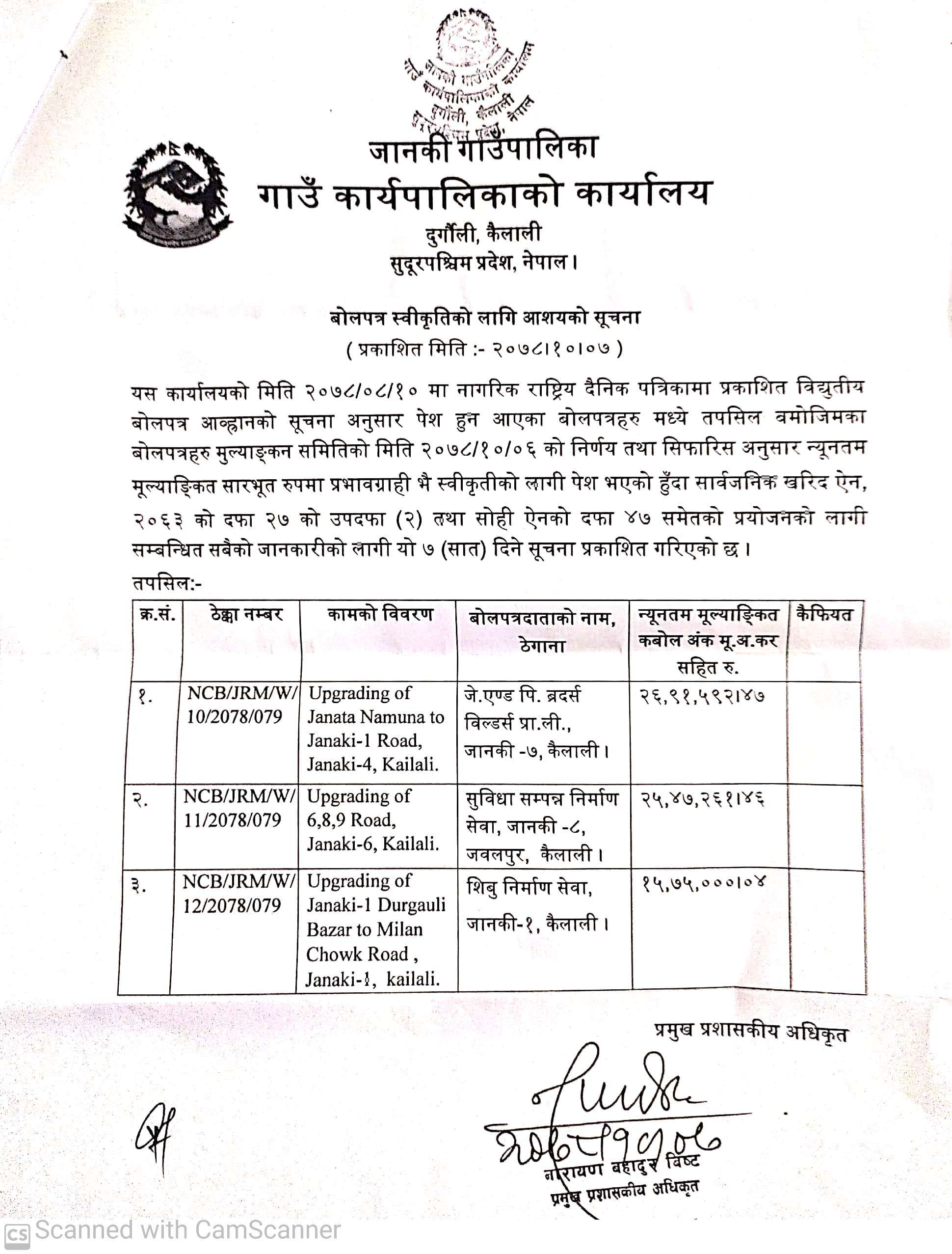 जानकी गाउँपालिका कैलालीको बोलपत्र स्वीकृतिको लागि आशय सम्बन्धी सूचना ।