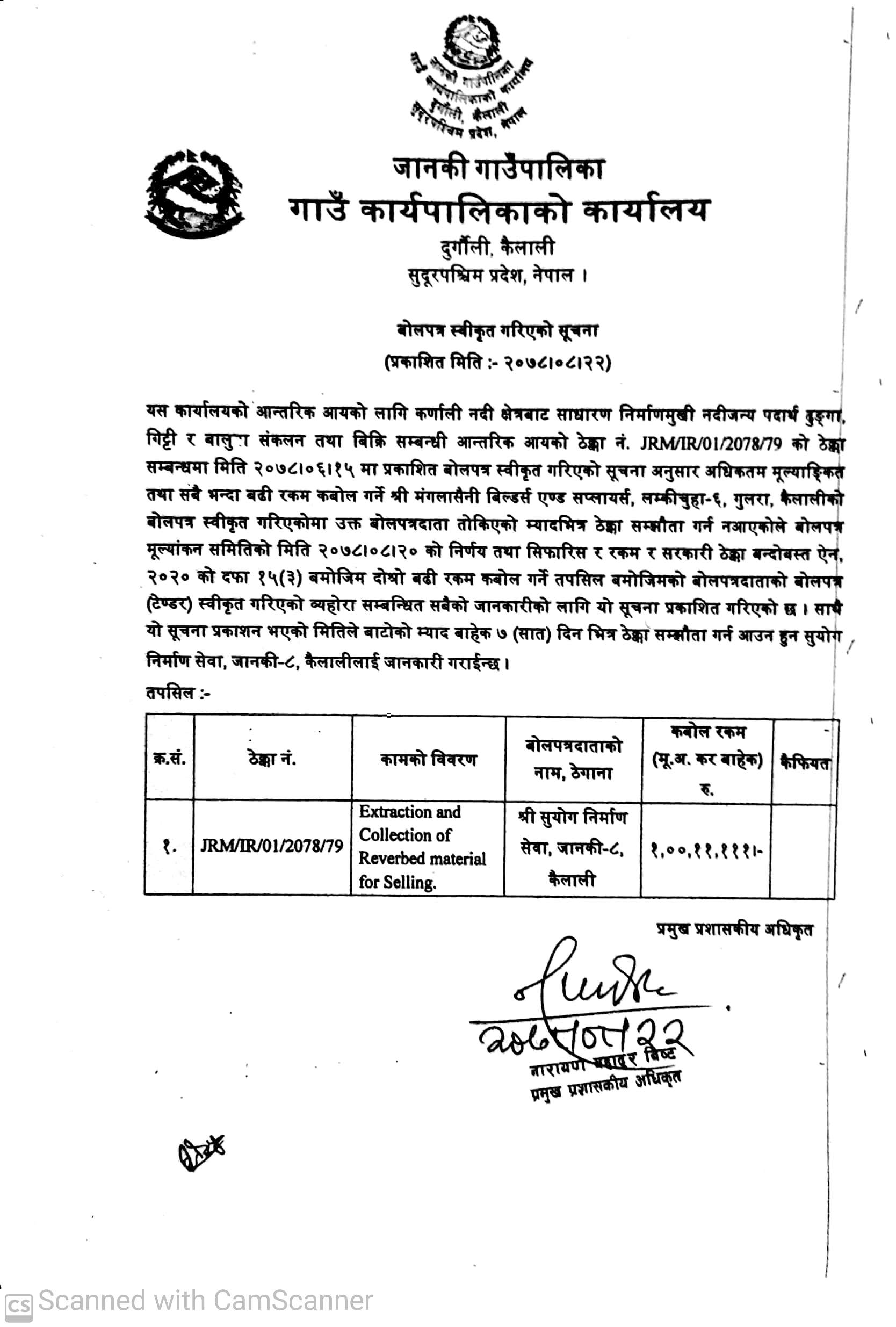 जानकी गाउँपालिका कैलालीको बोलपत्र स्वीकृति सम्बन्धी सूचना ।