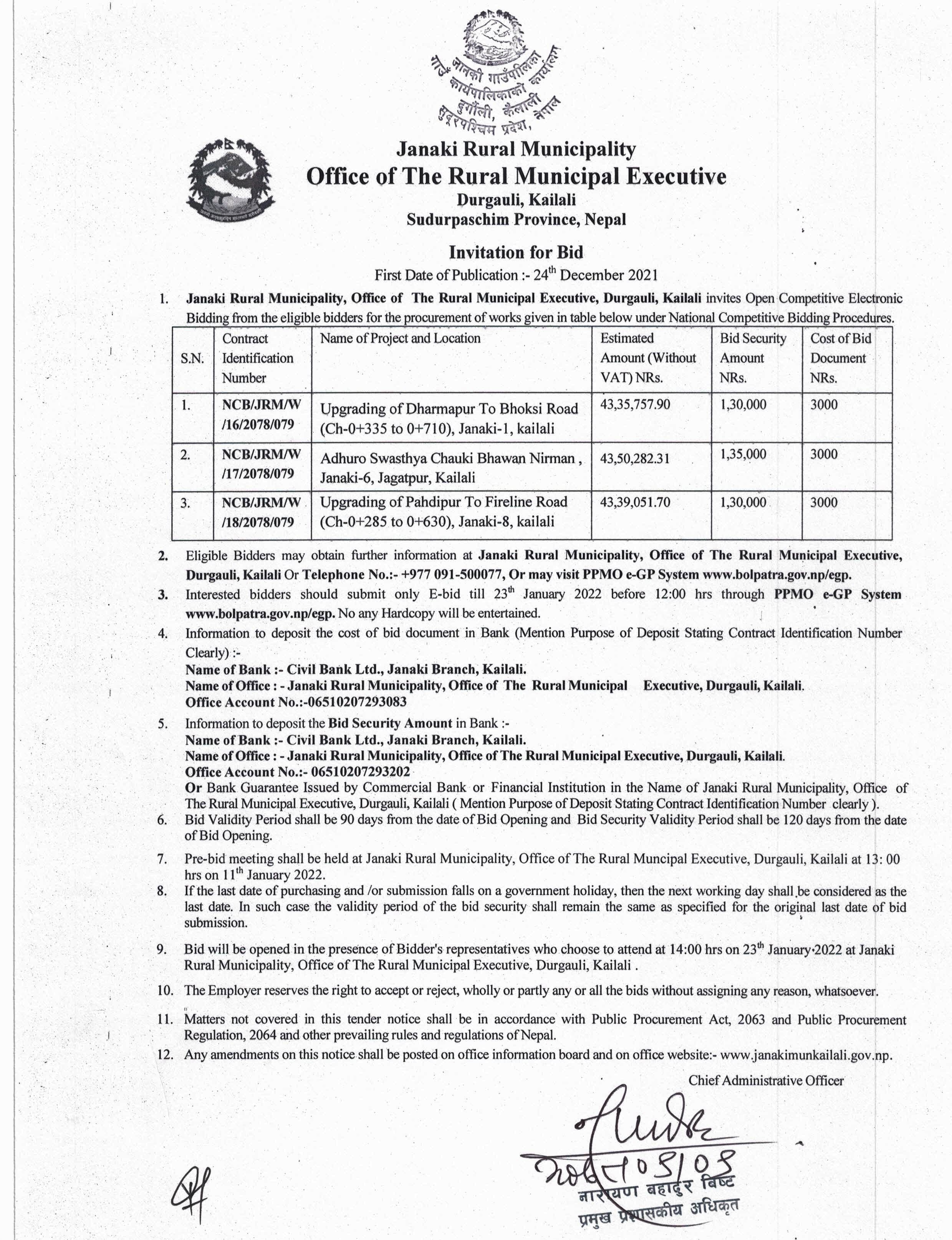 जानकी गाउँपालिका कैलालीको Invitation for Bid सम्बन्धी सूचना ।