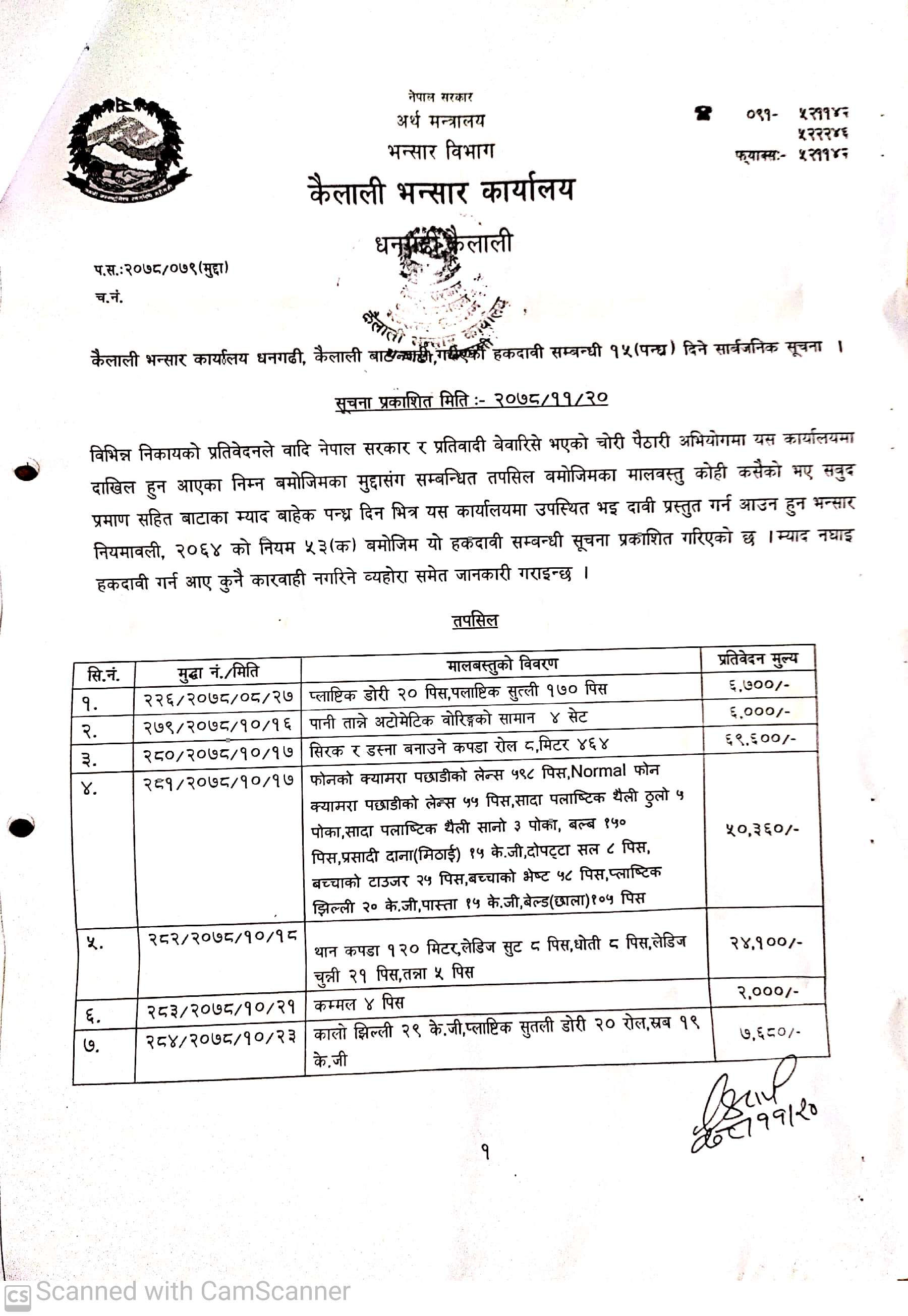 कैलाली भन्सार कार्यालय धनगढीको हकदाबी सम्बन्धी सूचना ।
