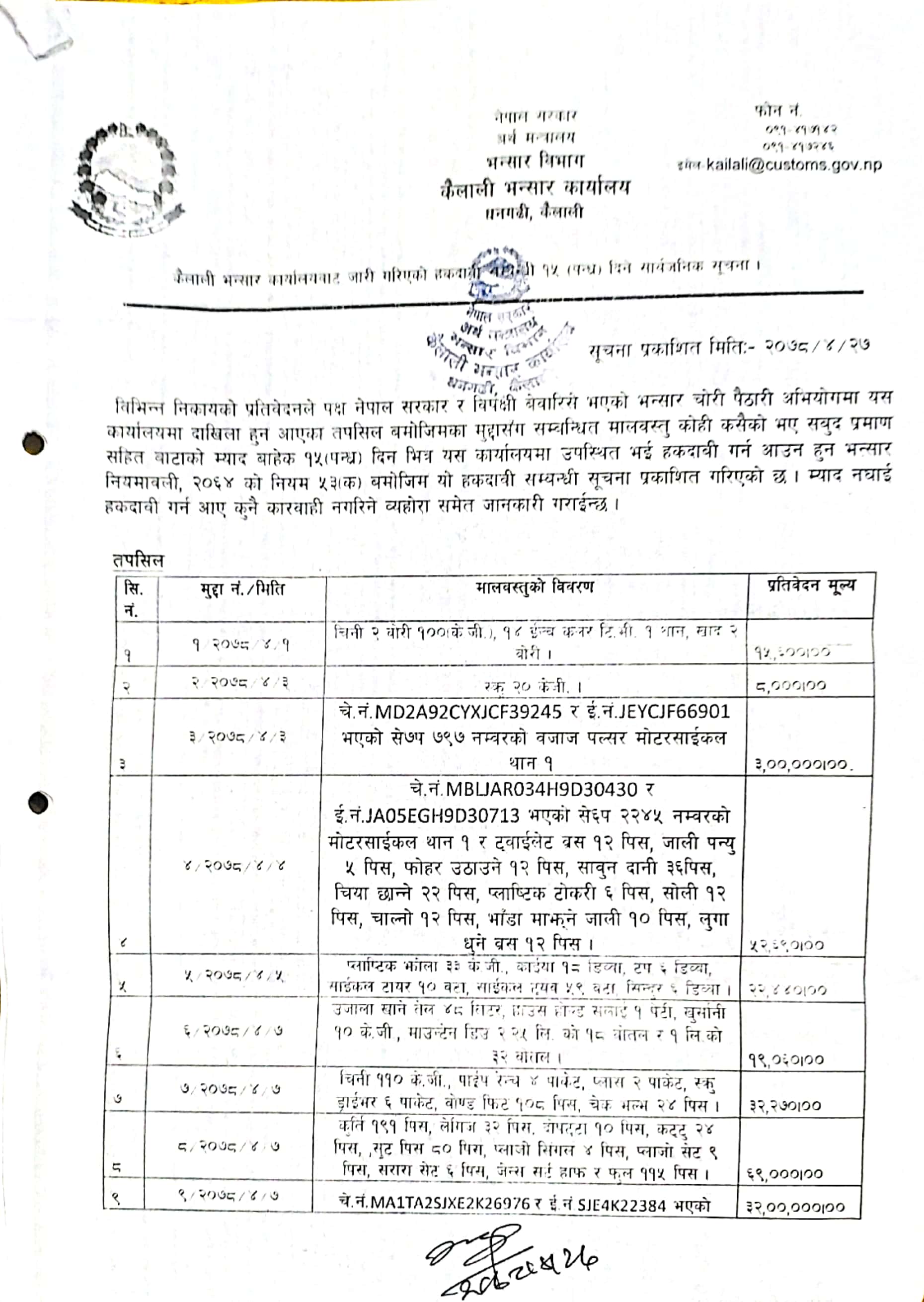 कैलाली भन्सार कार्यालयको हकदाबी सम्बन्धी सूचना ।