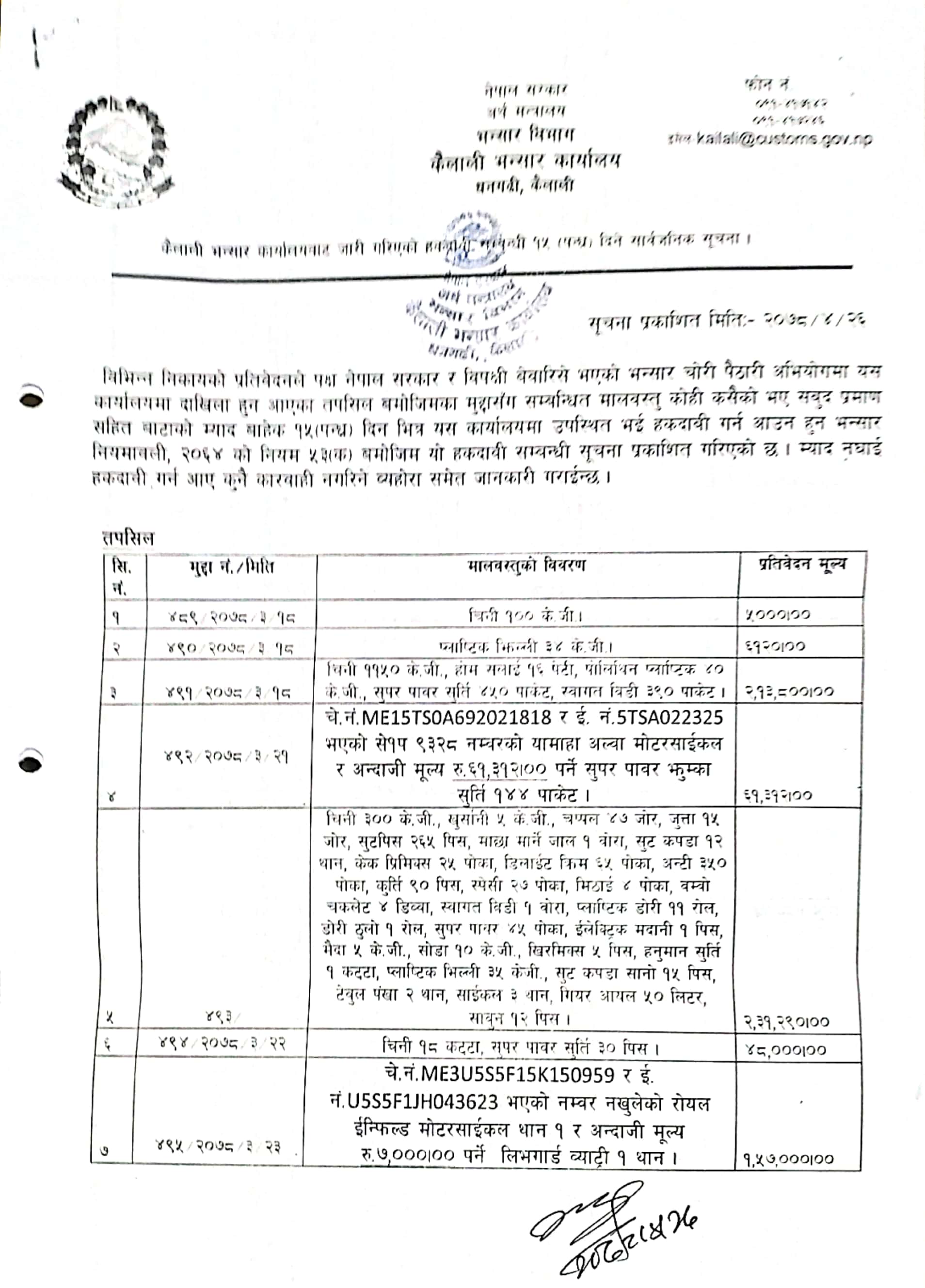 कैलाली भन्सार कार्यालयको हकदाबी सम्बन्धी सूचना ।