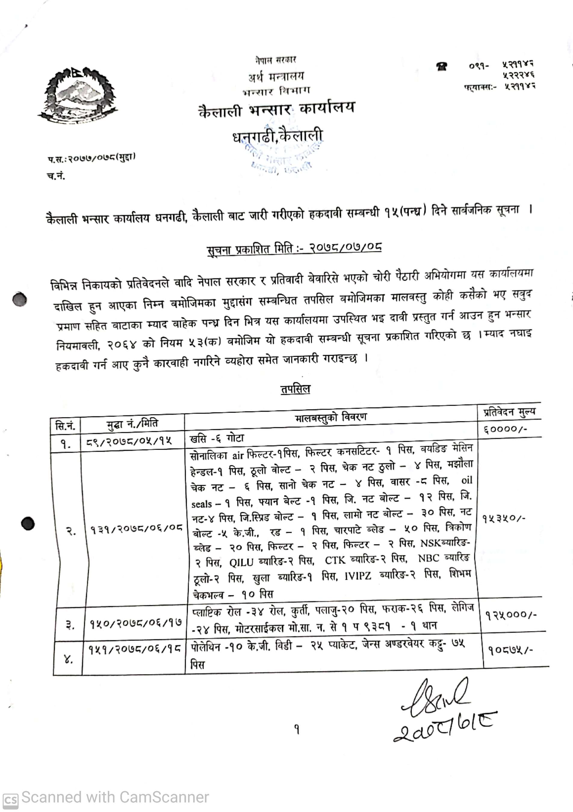 कैलाली भन्सार कार्यालयको हकदाबी सम्बन्धी सूचना ।