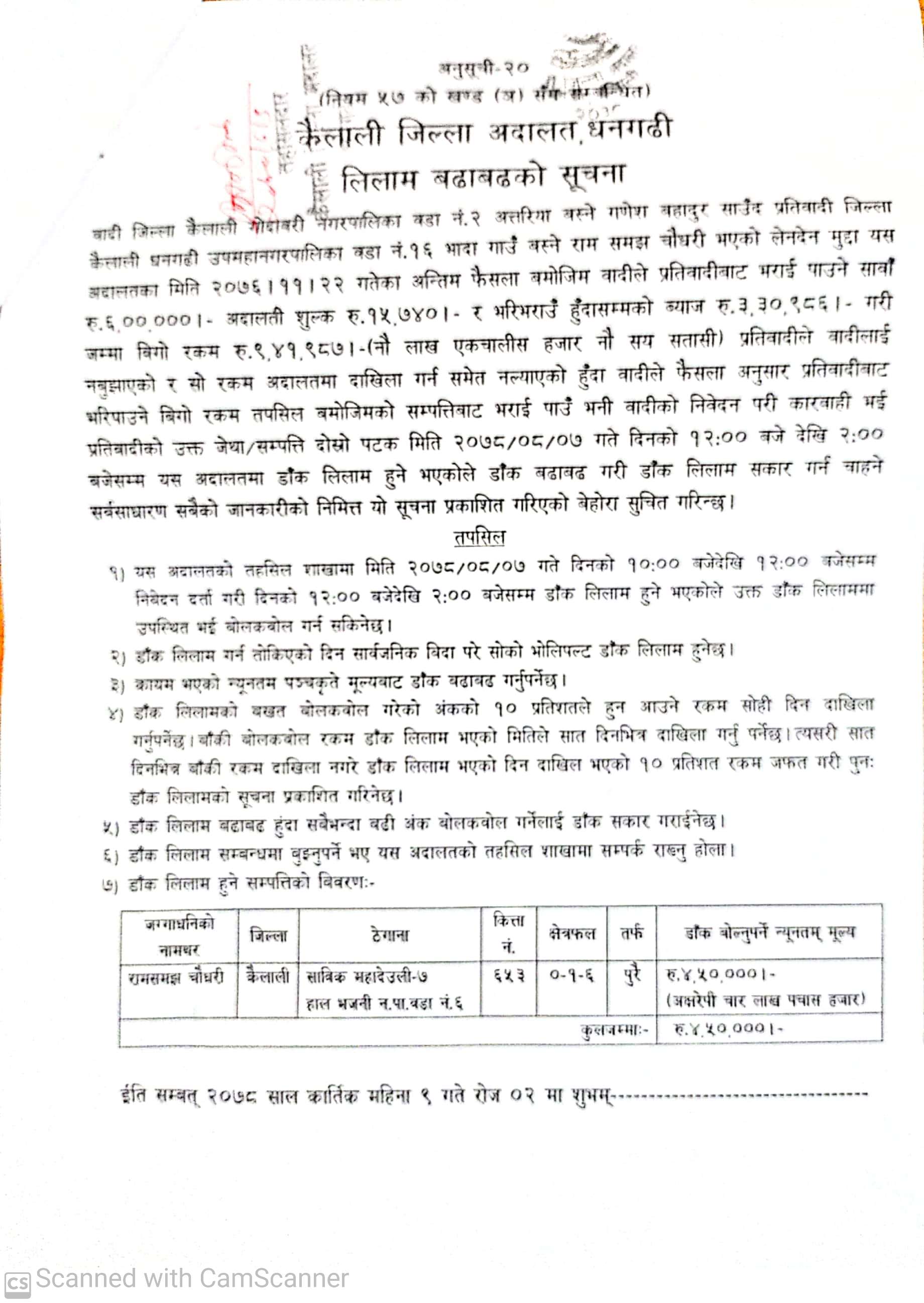 कैलाली जिल्ला अदालत धनगढीको लिलाम बढाबढको सूचना ।