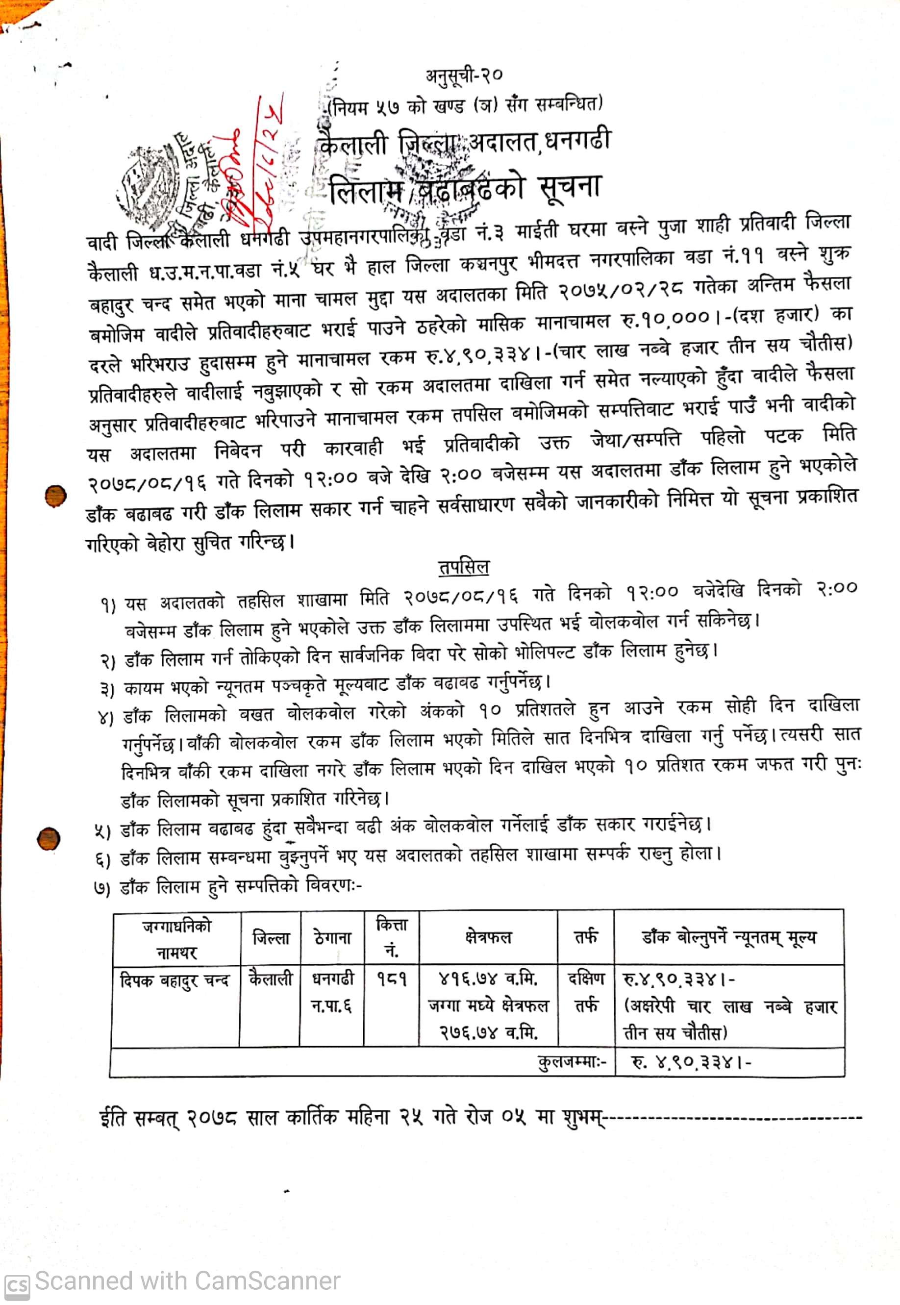 कैलाली जिल्ला अदालत धनगढीको लिलाम बढाबढको सूचना ।