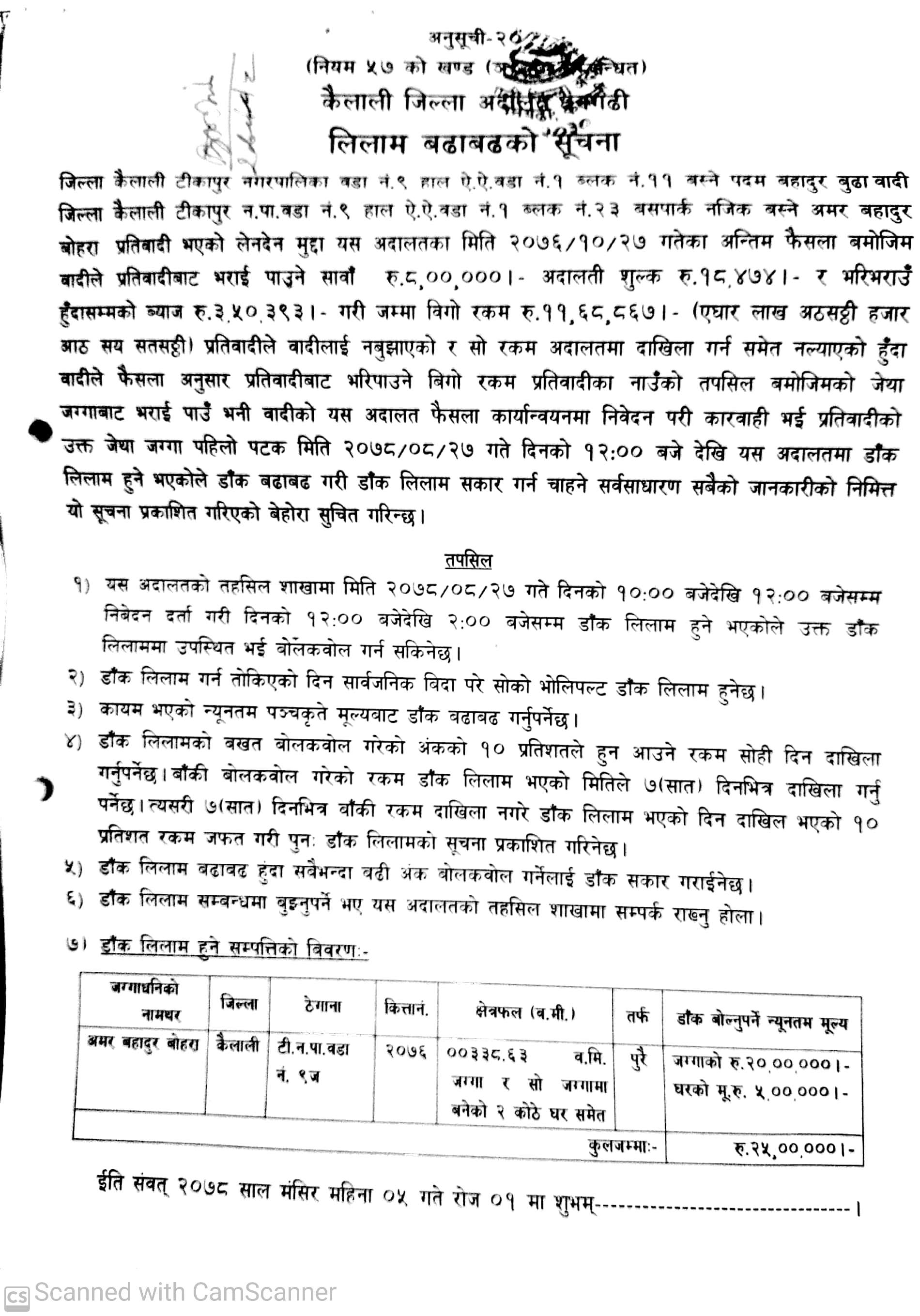 कैलाली जिल्ला अदालतको लिलामको सूचना । थान ३