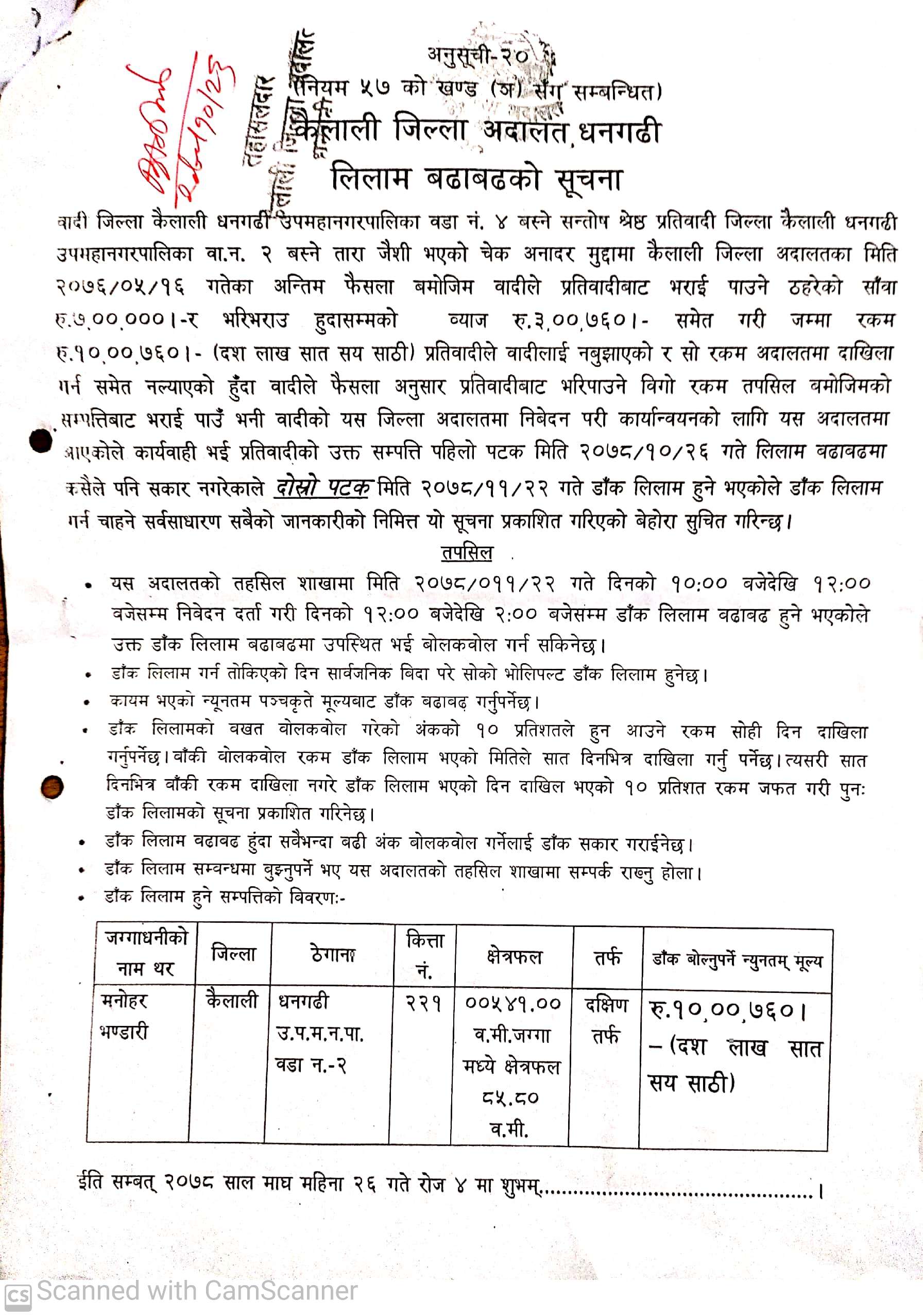 कैलाली जिल्ला अदालत धनगढीको लिलाम बढाबढको सूचना ।