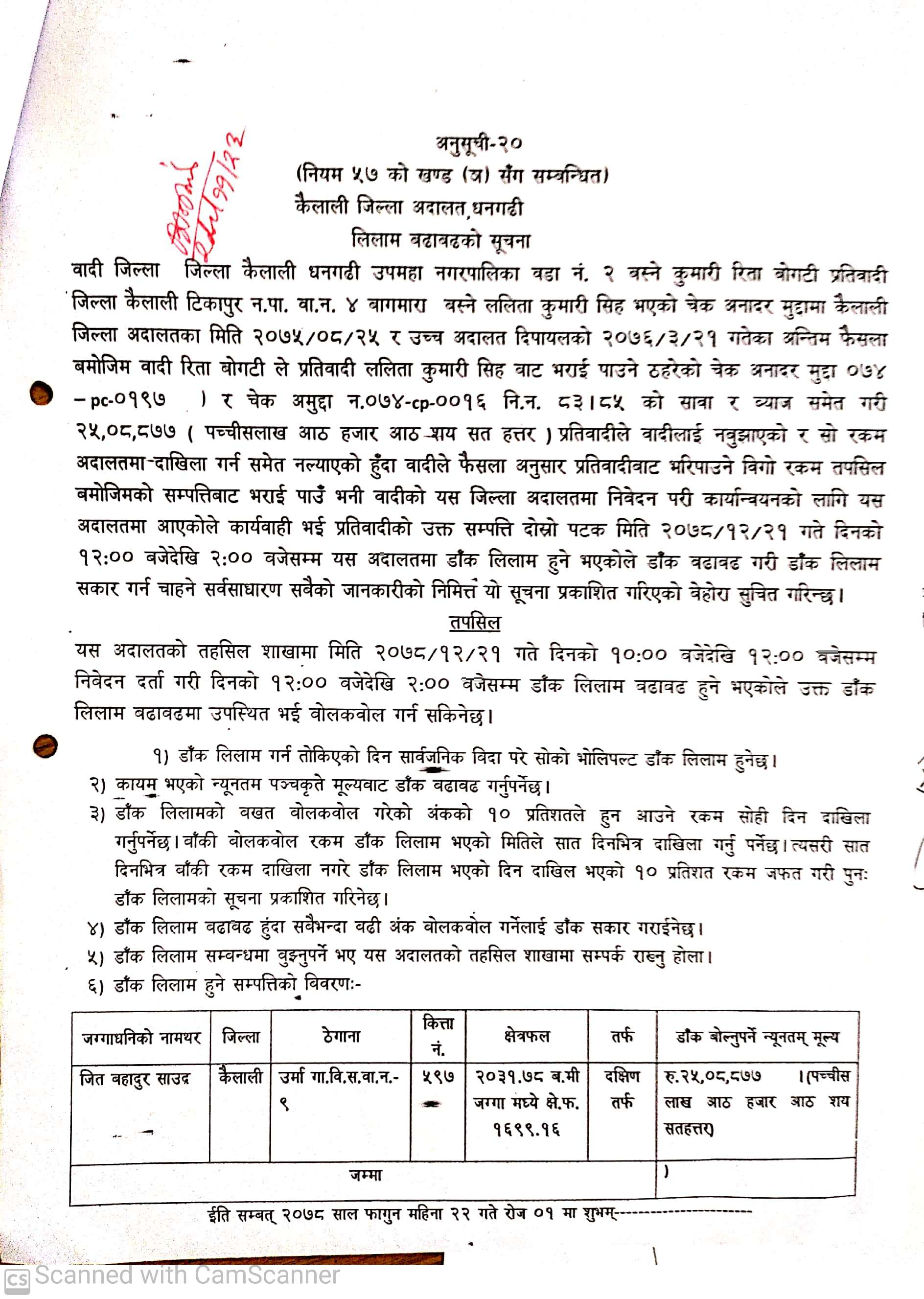 कैलाली जिल्ला अदालतको लिलामको सूचना । थान ३