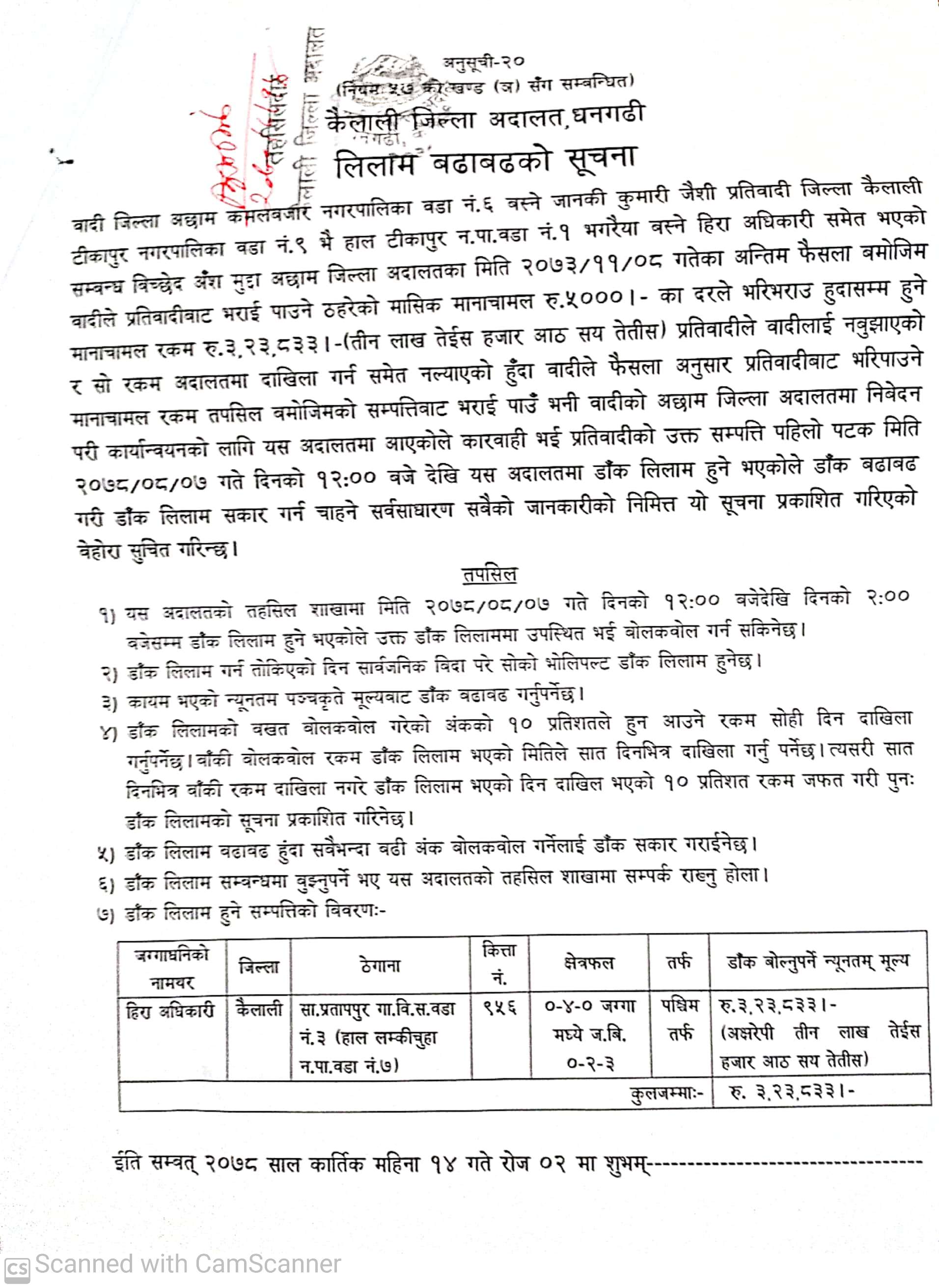 कैलाली जिल्ला अदालत धनगढीको लिलाम बढाबढको सूचना ।