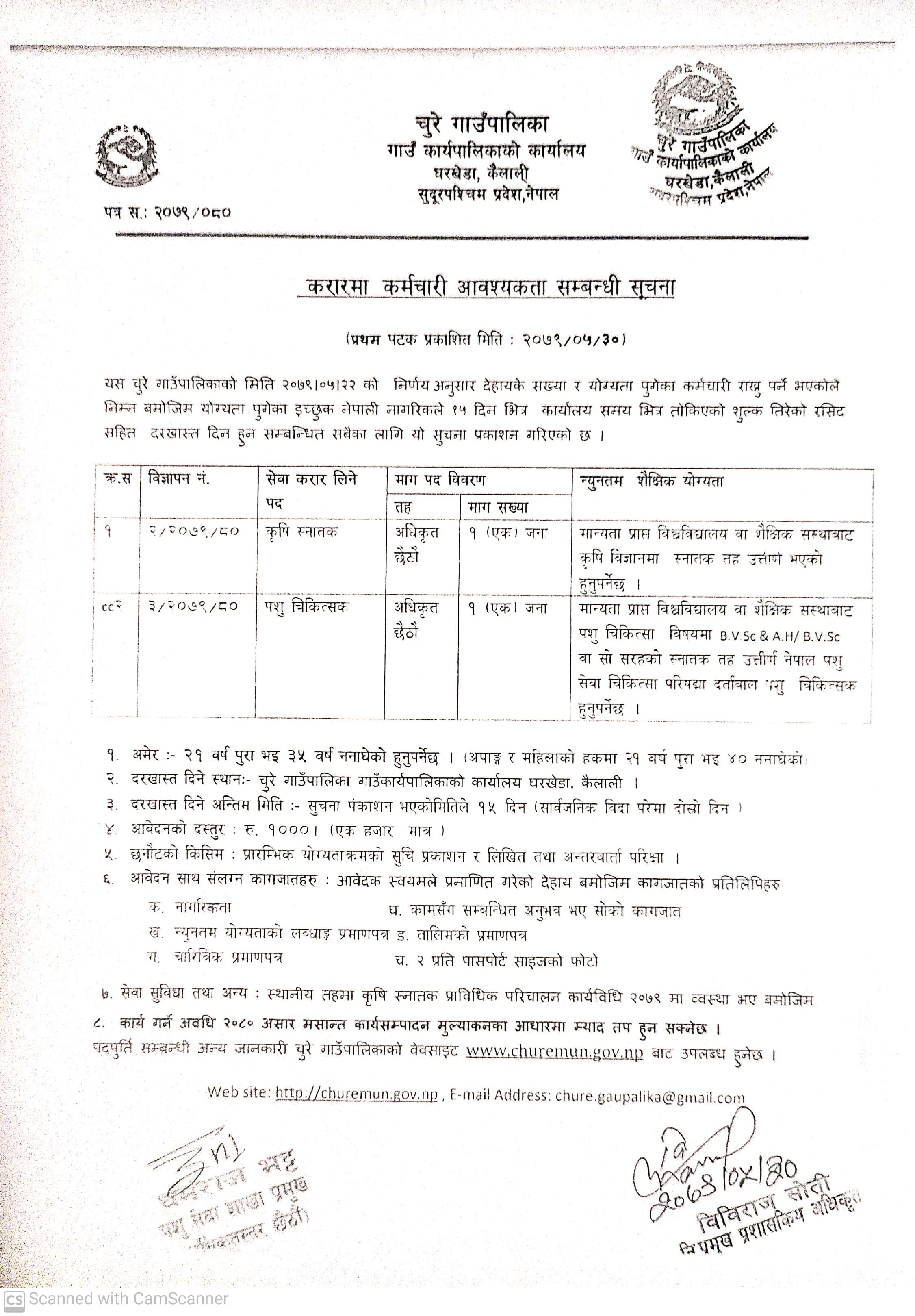 करार कर्मचारी आवश्यकता सम्बन्धी चुरे गाउँपालिकाको सूचना ।