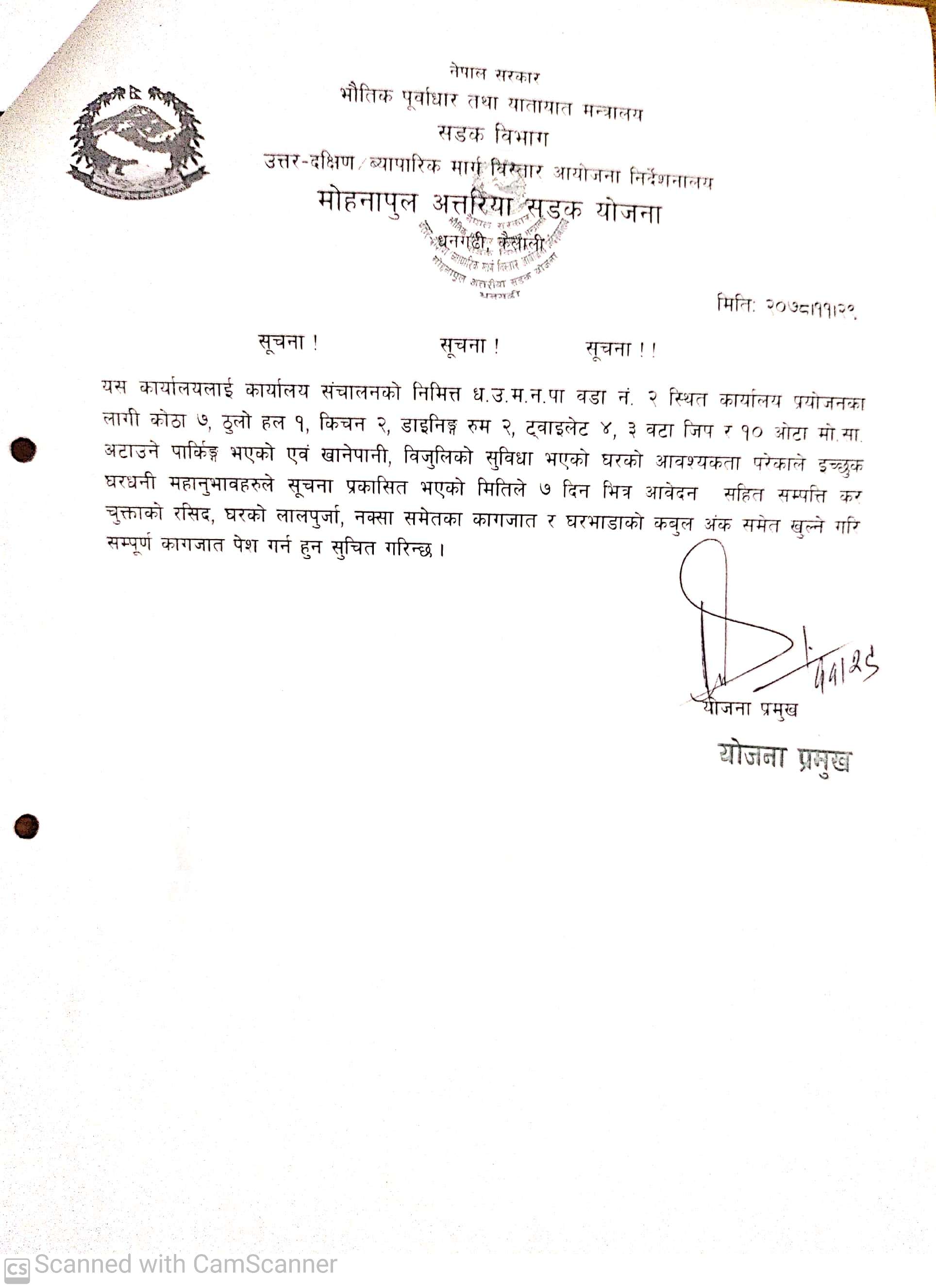 मोहनापुल अत्तरिया सडक योजनाको घरभाडाको सूचना ।