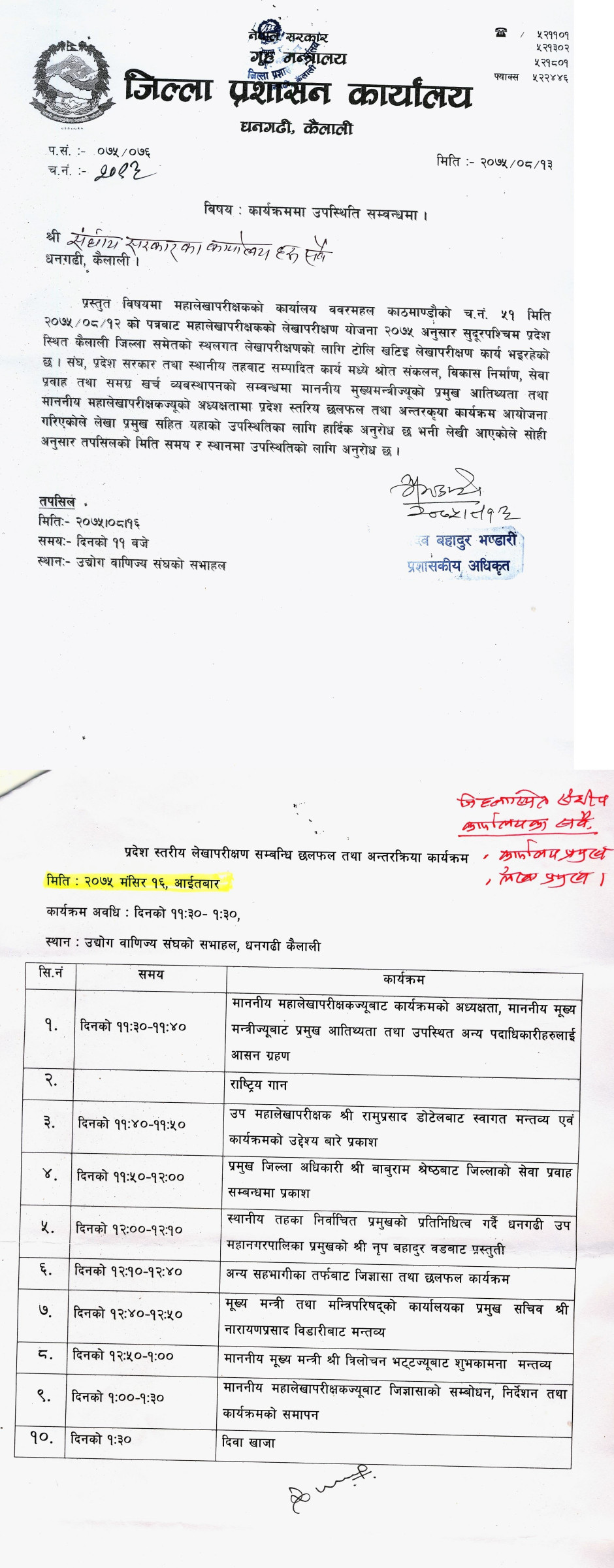 मिति २०७५।८।१६ गतेको म.ले.पा.को आयोजनामा हुने कार्यक्रम सम्बन्धी सूचना संलग्न छ ।