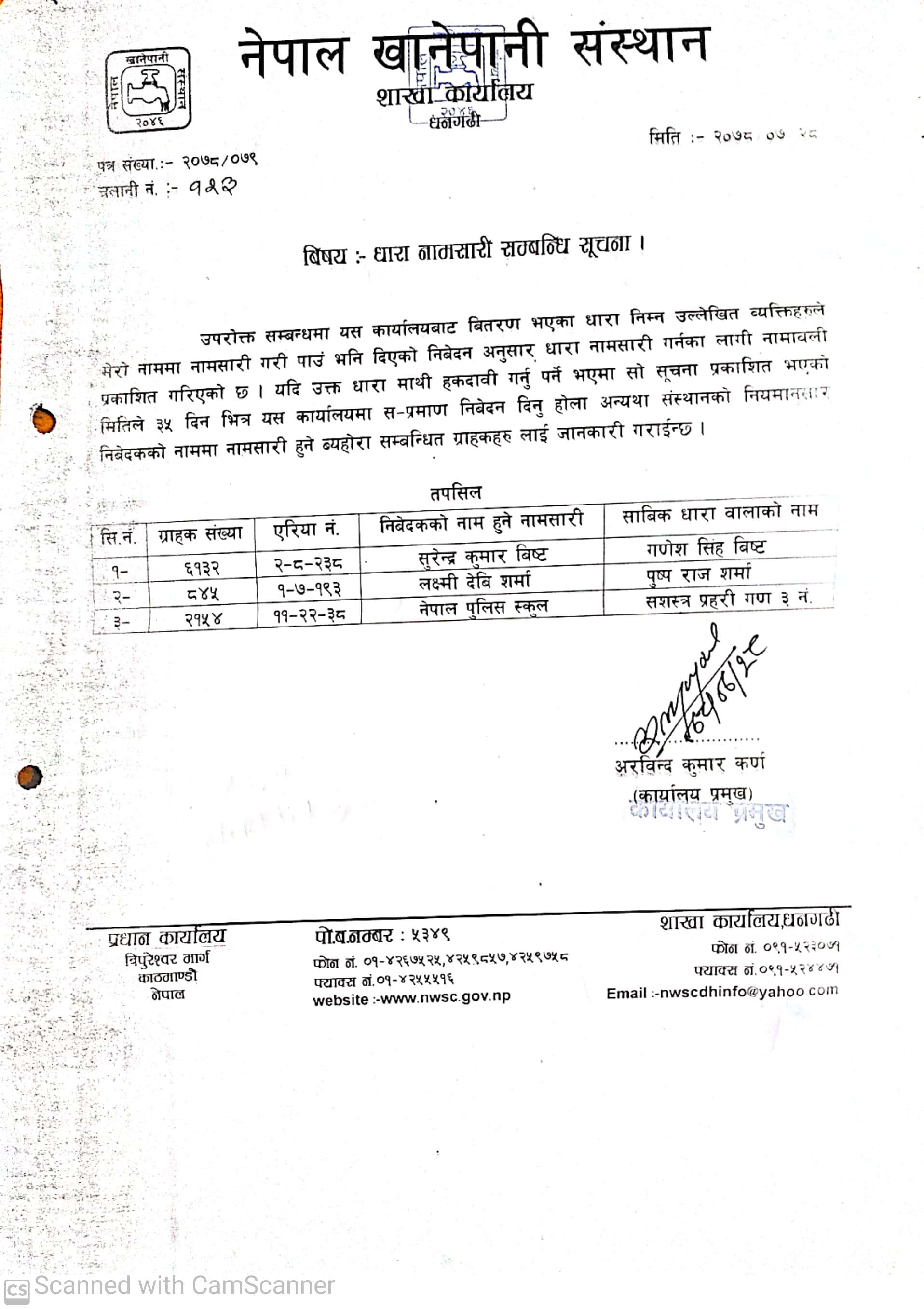 नेपाल खानेपानी संस्थान धनगढीको धारा नामसारीको सूचना ।