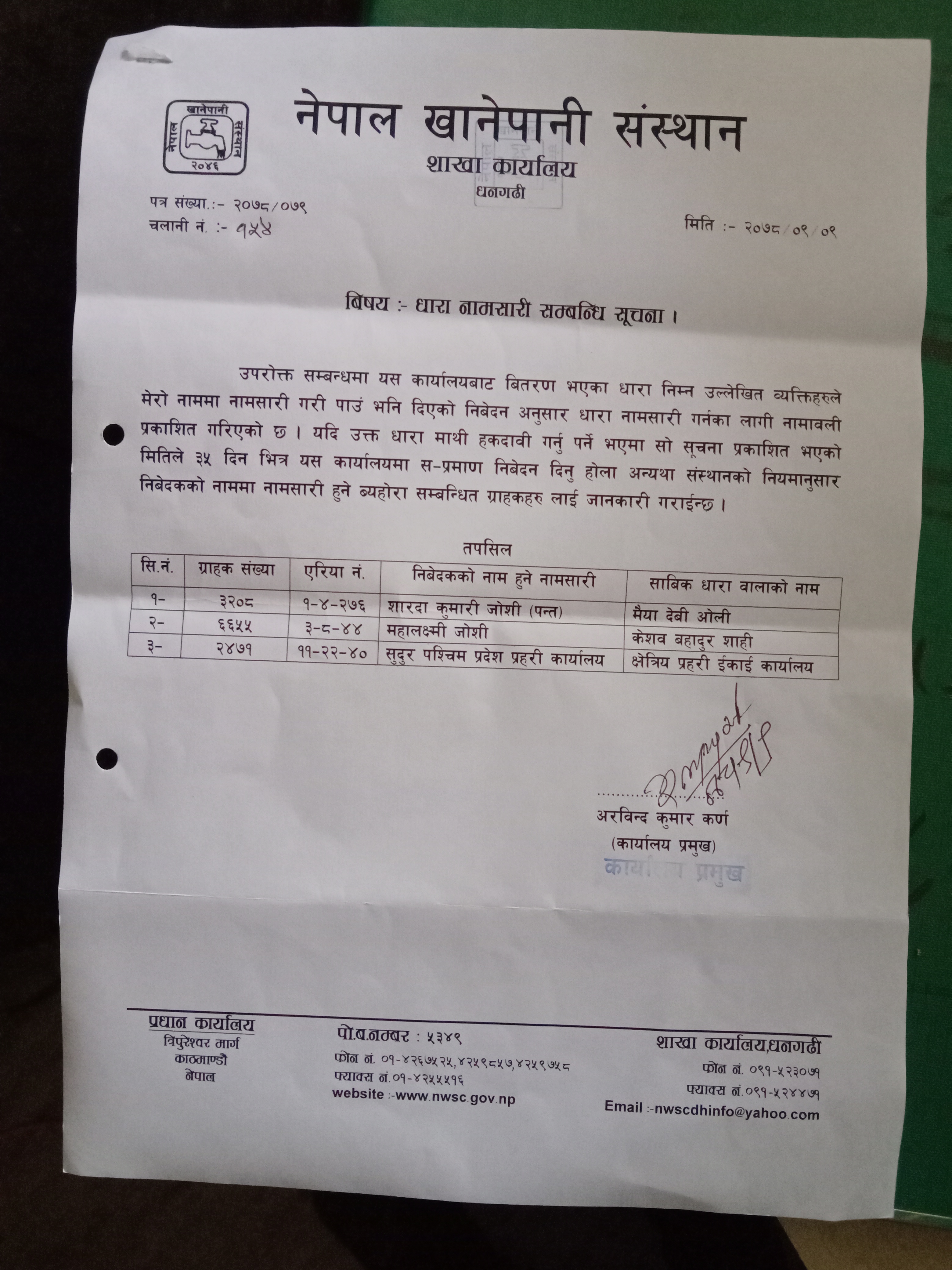 नेपाल खानेपानी संस्थान धनगढीको धारा नामसारीको सूचना ।